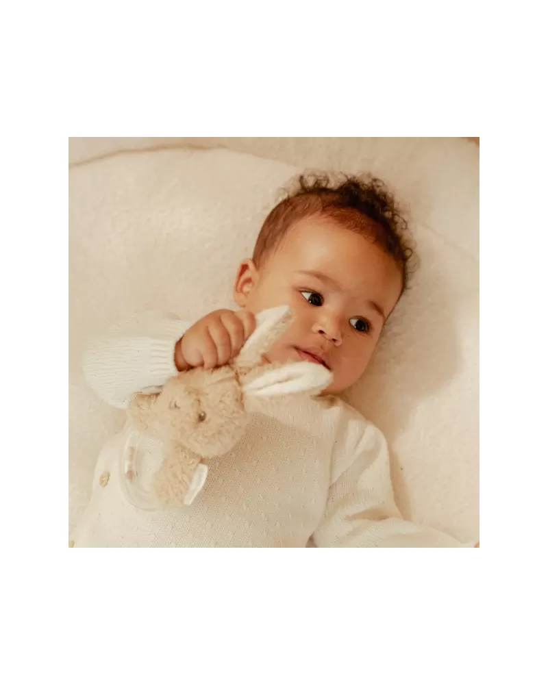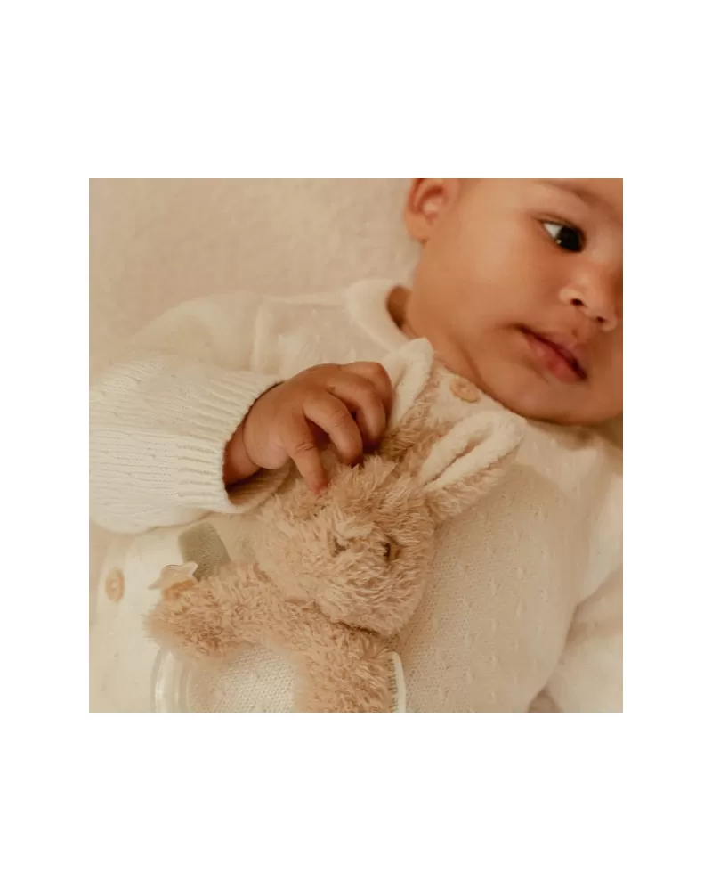 Originální chrastítko v podobě průhledného kroužku s chrasticími korálky a plyšovým králíčkem je ideální jako první hračka pro vaše miminko. Chrastítko má tvar pro snadné uchopení a různorodé textury pro zkoumání rukama i ústy.