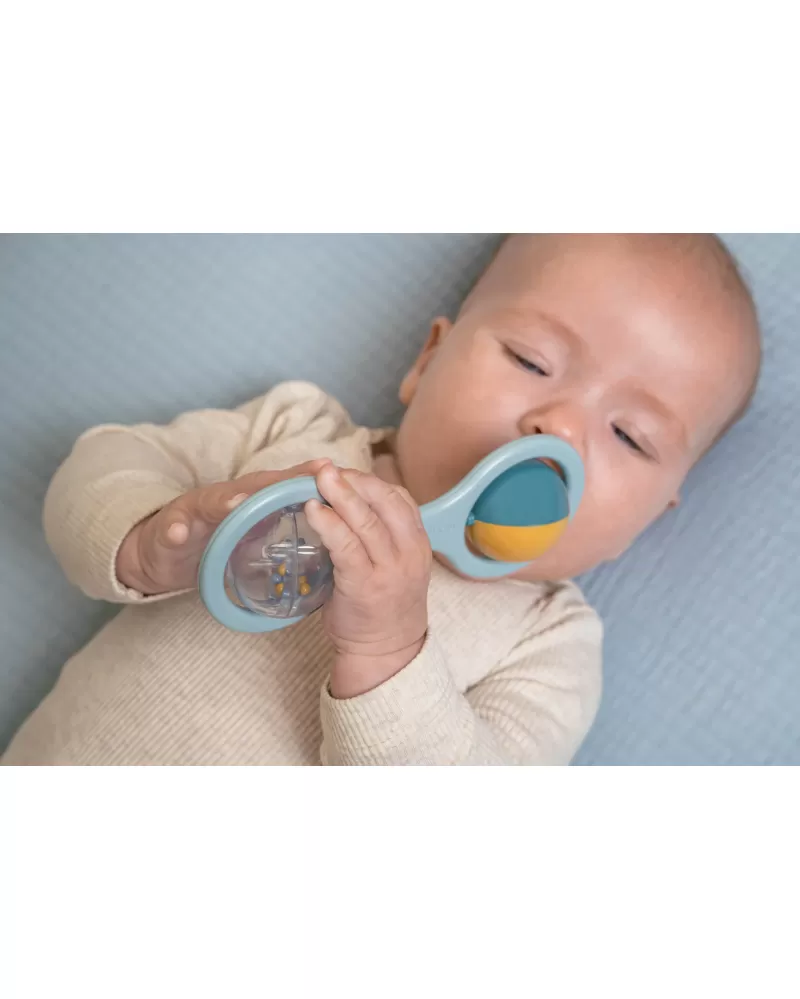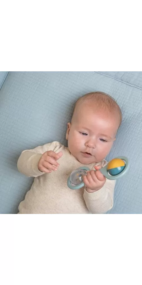 Chrastítko se dvěma otáčejícími se kuličkami je ideální jako první hračka pro vaše miminko. Pozornost dítěte upoutají chrasticí korálky v průhledné kuličce i střídající se barvy při otáčení dvoubarevné kuličky. Chrastítko má tvar pro snadné uchopení malými dětskými ručičkami.