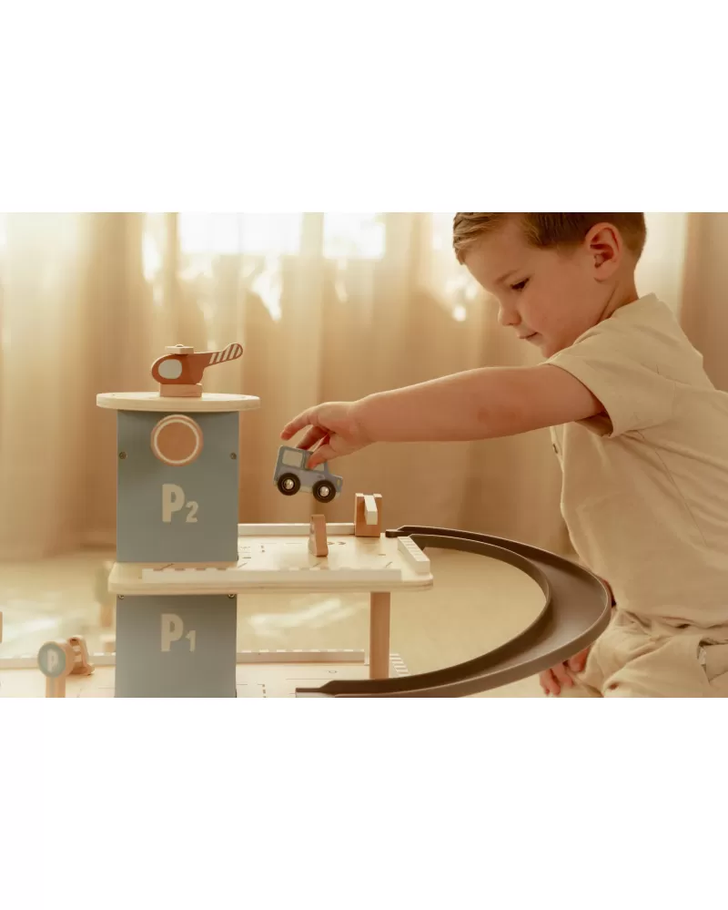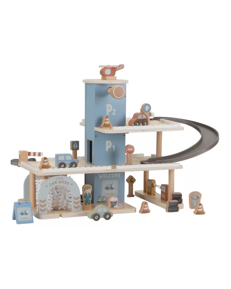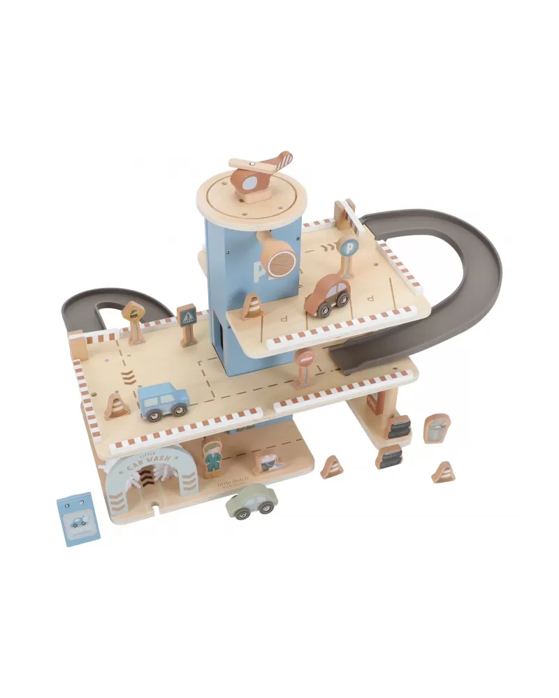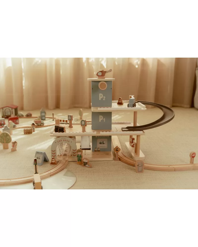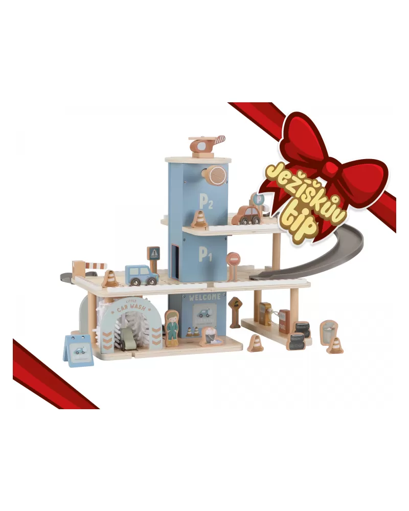 Zaparkuj, natankuj a hurá na výlet! Garáž má přízemí s myčkou, dvě patra pro parkování, nabíjecí stanici pro elektromobily a přistávací plochu pro vrtulník na střeše. V balení dále najdete tři dřevěná autíčka, vrtulník, figurku řidiče a další doplňky (dopravní značky, kužely, pneumatiky, kbelík atd.).