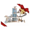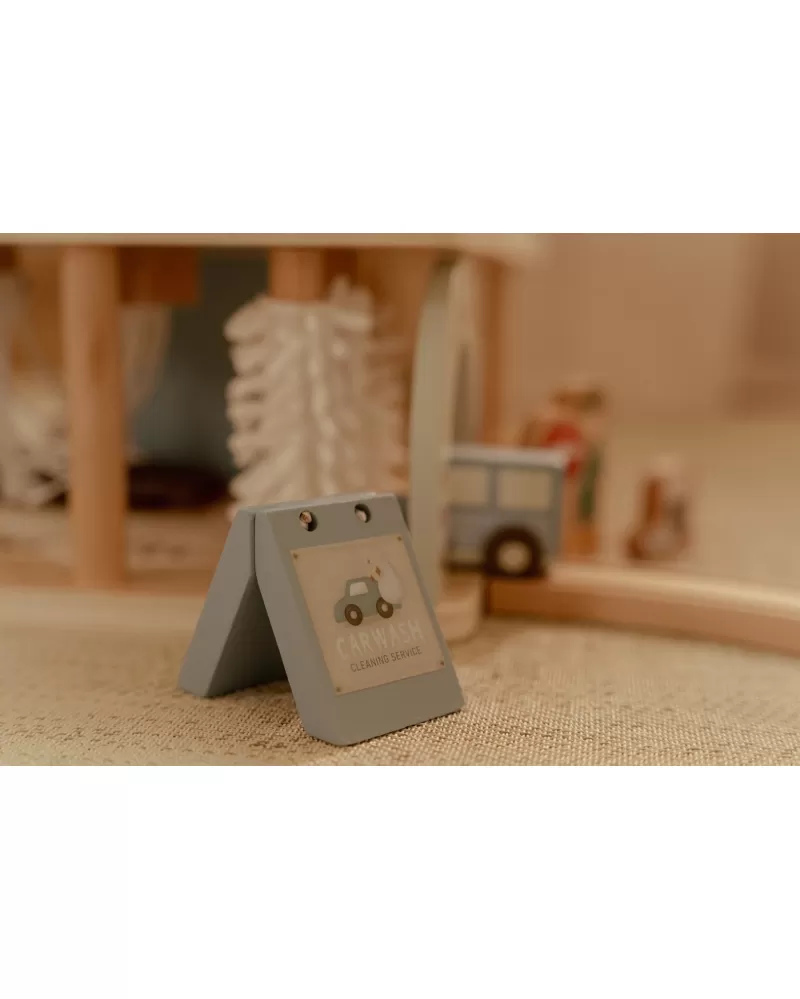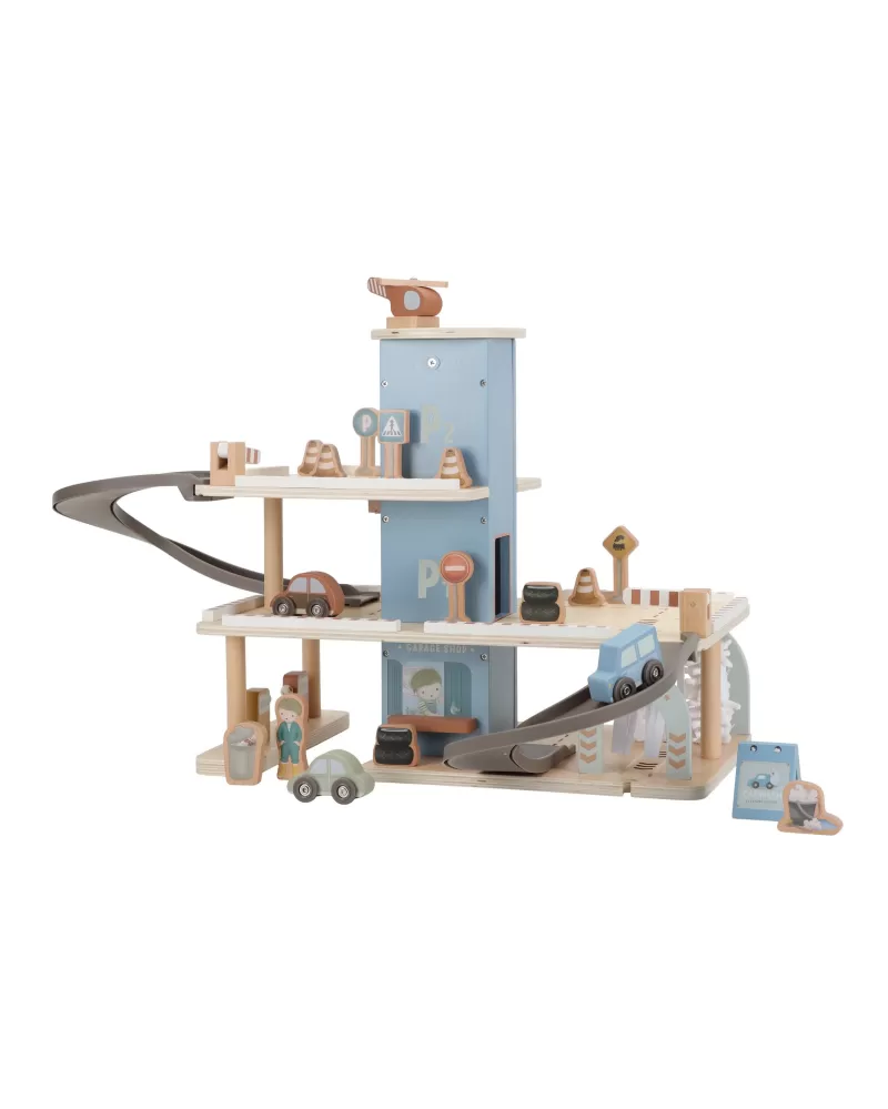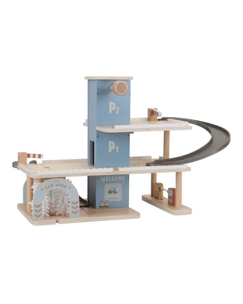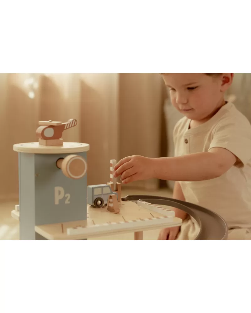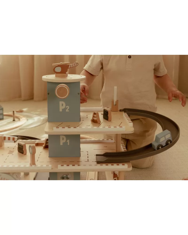 Zaparkuj, natankuj a hurá na výlet! Garáž má přízemí s myčkou, dvě patra pro parkování, nabíjecí stanici pro elektromobily a přistávací plochu pro vrtulník na střeše. V balení dále najdete tři dřevěná autíčka, vrtulník, figurku řidiče a další doplňky (dopravní značky, kužely, pneumatiky, kbelík atd.).
