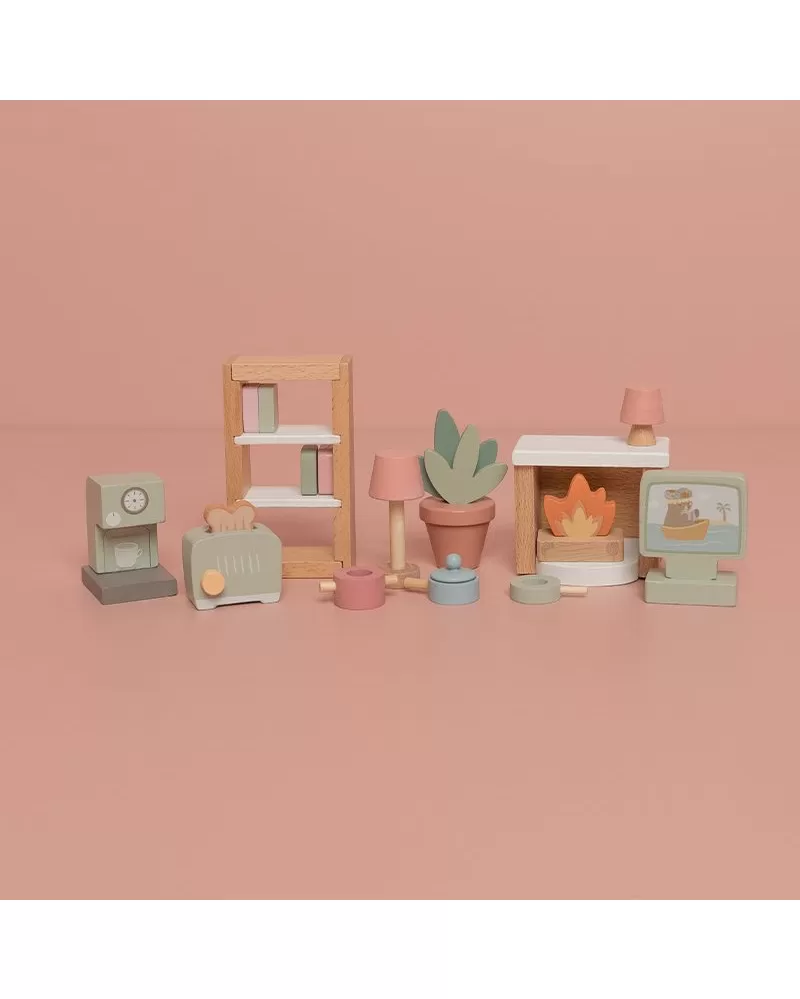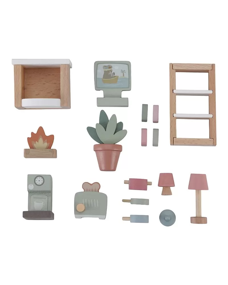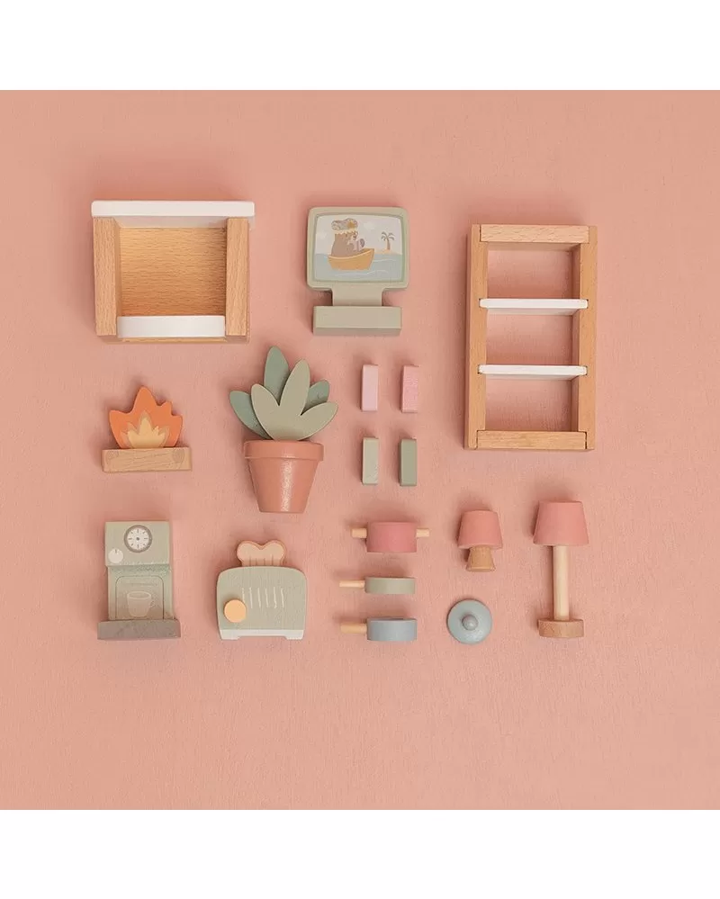 Sada doplňků do obývacího pokoje a kuchyně v krásném dřevěném provedení vhodně doplňuje vybavení dřevěného domečku pro panenky Little Dutch.