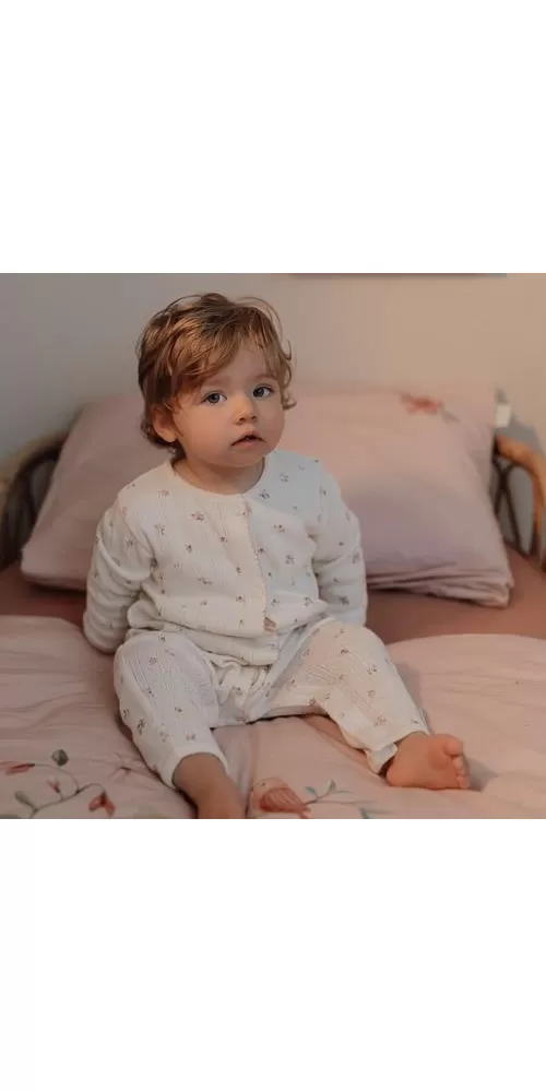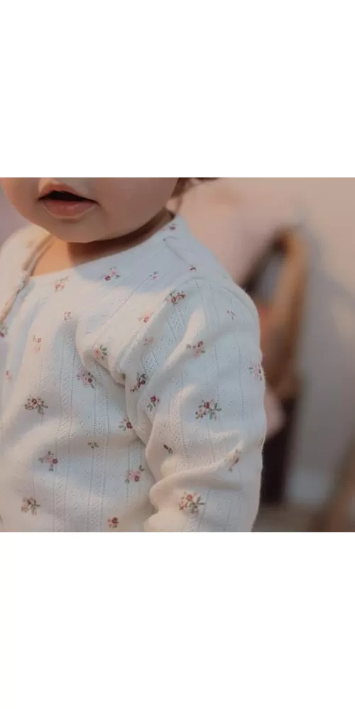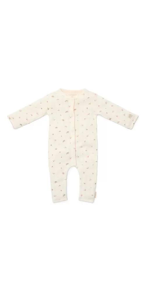 Overal na spaní z měkké organické bavlny s jemným květinovým potiskem má zapínání na patentky na přední straně a v rozkroku pro snadné oblékání i přebalování dítěte.