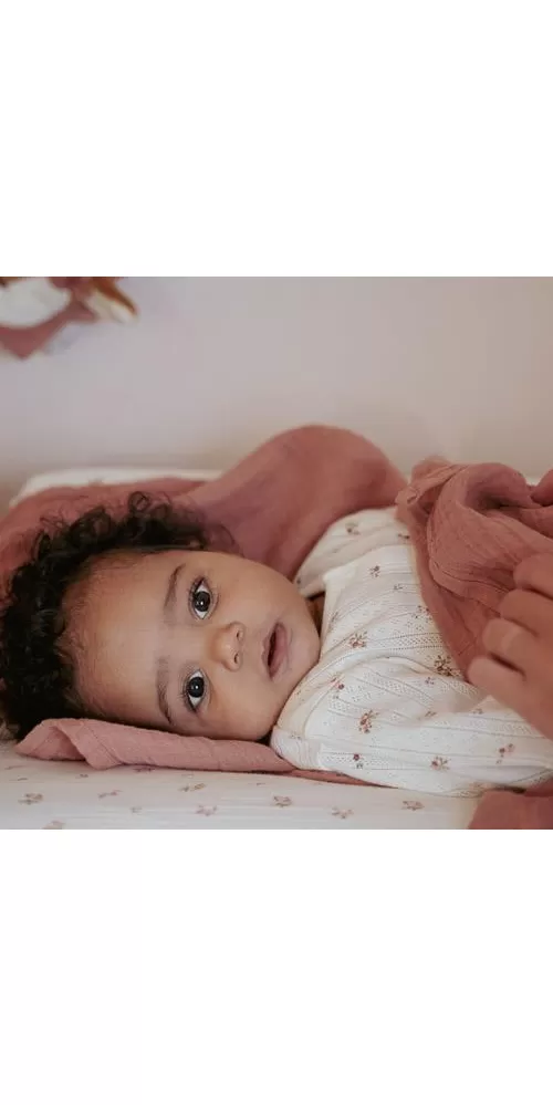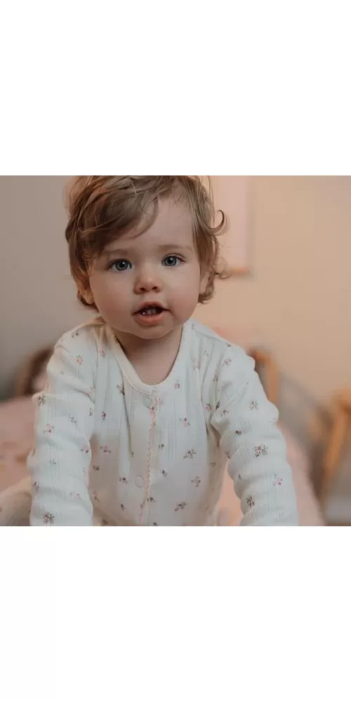 Overal na spaní z měkké organické bavlny s jemným květinovým potiskem má zapínání na patentky na přední straně a v rozkroku pro snadné oblékání i přebalování dítěte.