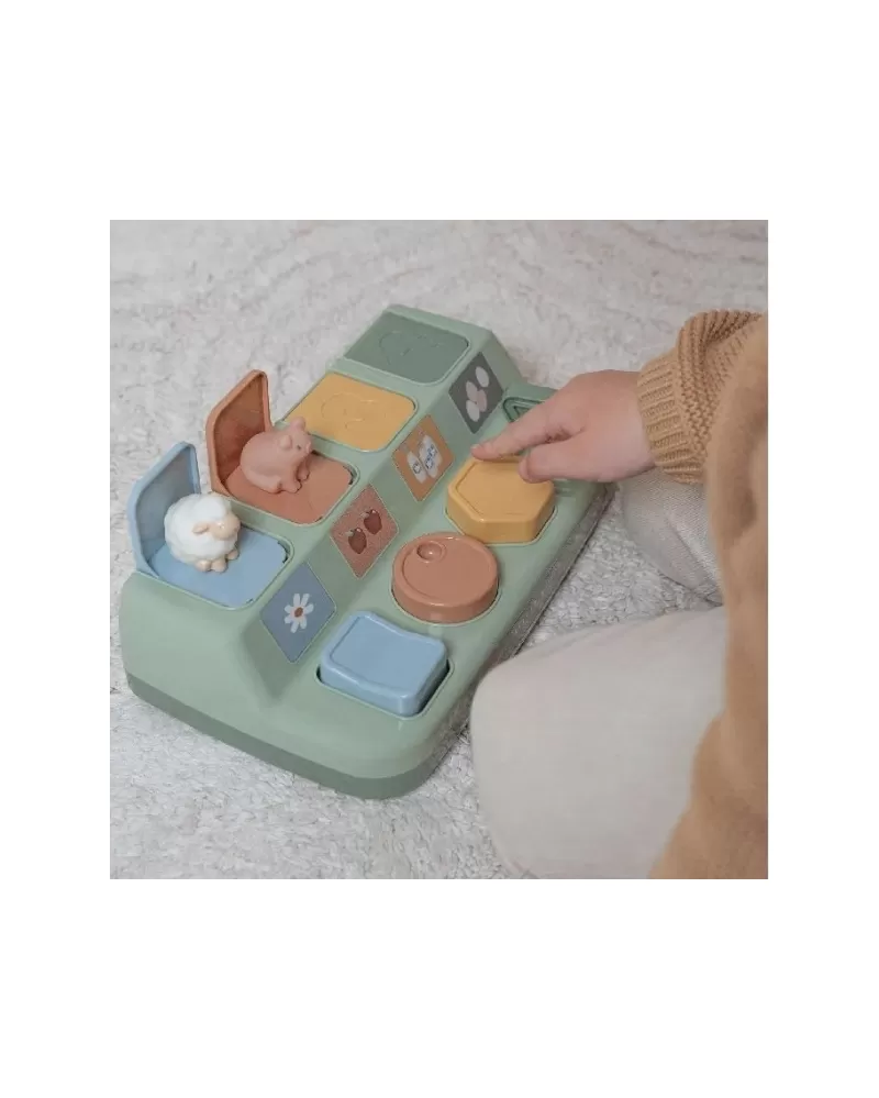 Zábavný hrací pultík pro hru na schovávanou se zvířátky podporuje fantazii, kreativitu i motorické dovednosti vašeho dítěte. Které zvířátko se objeví, když stisknete tlačítko? Je to ovečka, prasátko, kravička nebo kuřátko? Pultík můžete využít i pro společnou hru se svým dítětem, učit ho poznávat barvy a tvary i vymýšlet spolu příběhy o zvířátkách.