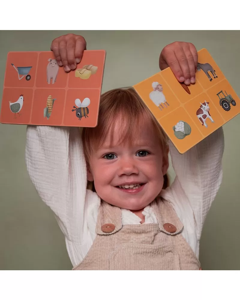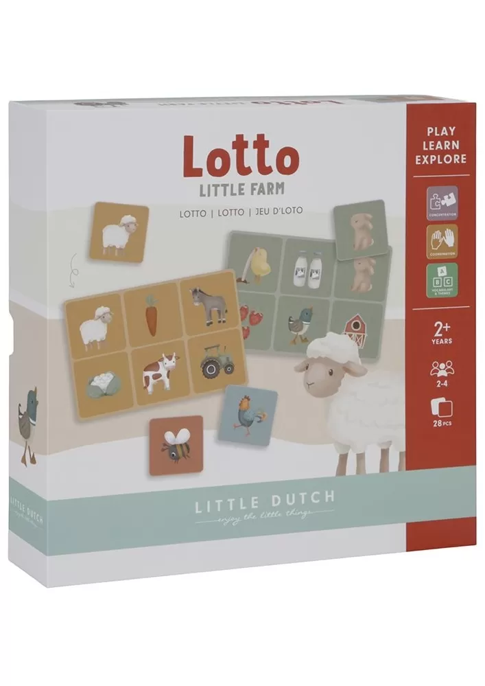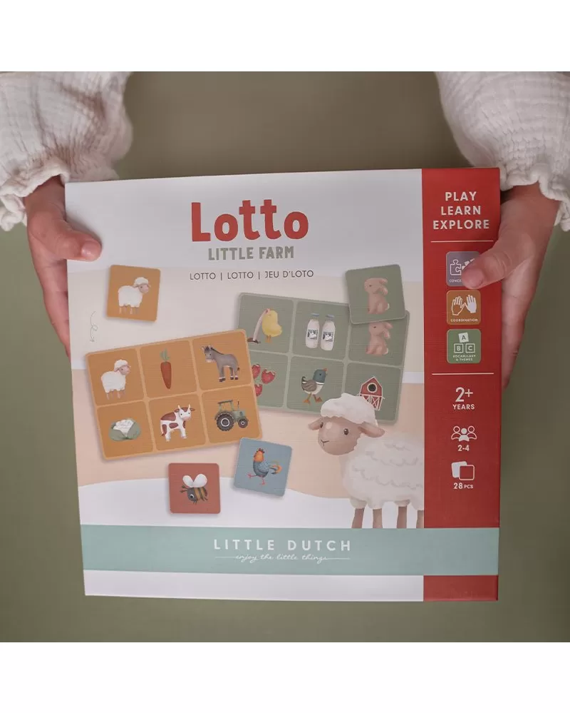 Hra Lotto pomáhá dítěti naučit se soustředit se a stimulovat sociální dovednosti. Hra je určena pro 2 až 4 hráče. Obsahuje čtyři desky s motivy ze života na farmě. Otočte kartičku a zkontrolujte, zda je na vaší desce. Hru vyhrává ten, kdo první najde všechny obrázky na své desce.