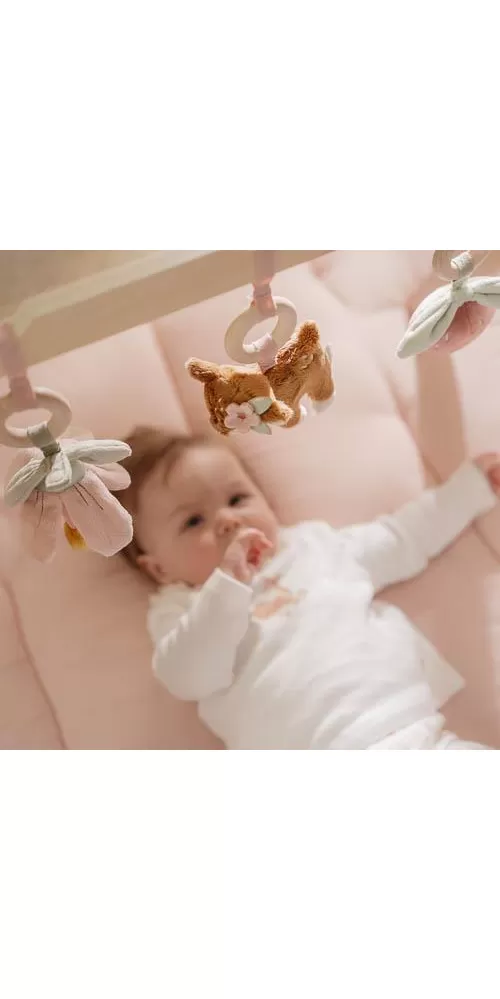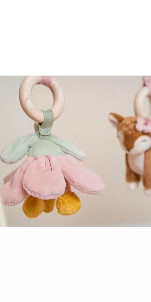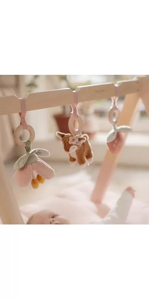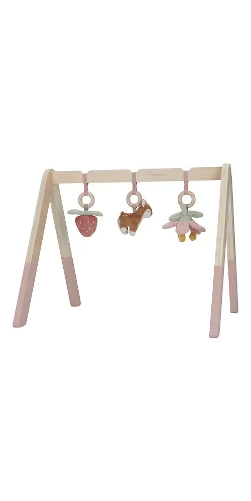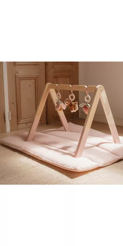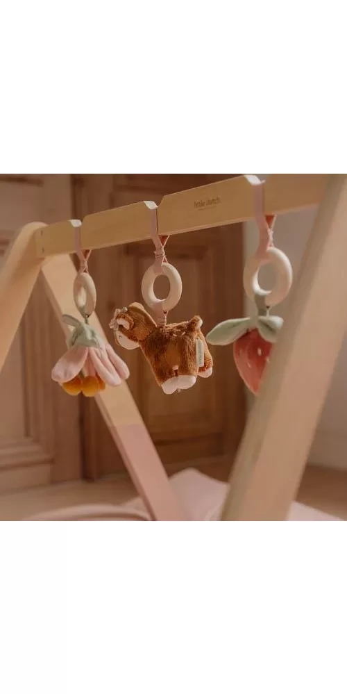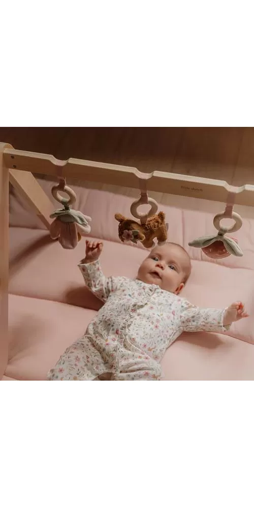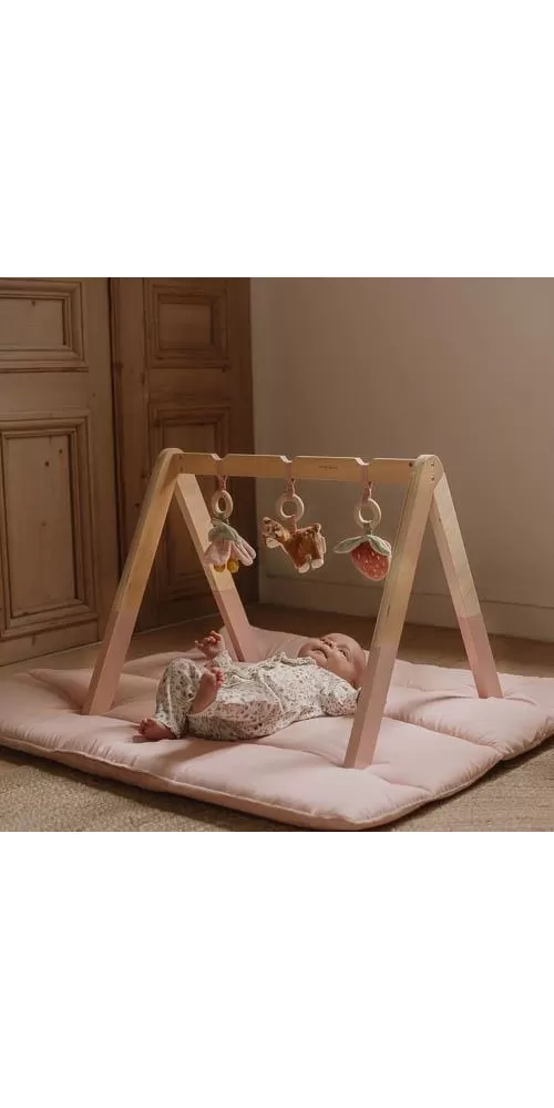 Stylová dřevěná hrazdička se třemi zavěšenými plyšovými hračkami v podobě srnky, jahůdky a kytičky poskytne vašemu miminku spoustu zábavy při hraní na dece. Jednotlivé hračky lákají dítě ke zkoumání a dotýkání, při pohybu chrastí a šustí.