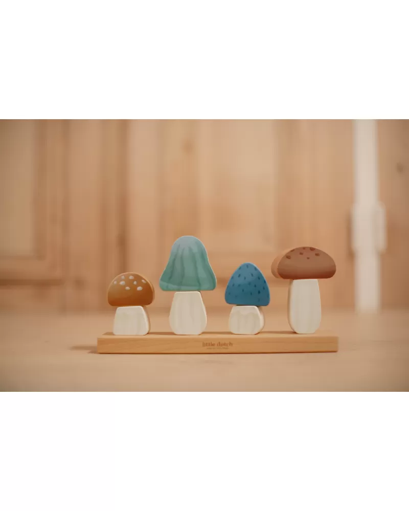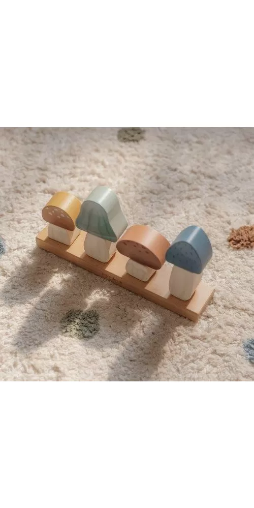Krásné dřevěné houby jsou tvořeny dvěma díly - kloboučkem a nohou, které se postupně navlékají na stonek na základně. Kloboučky a nohy jsou libovolně kombinovatelné a je tak možné tvořit pokaždé jiné varianty houbiček.