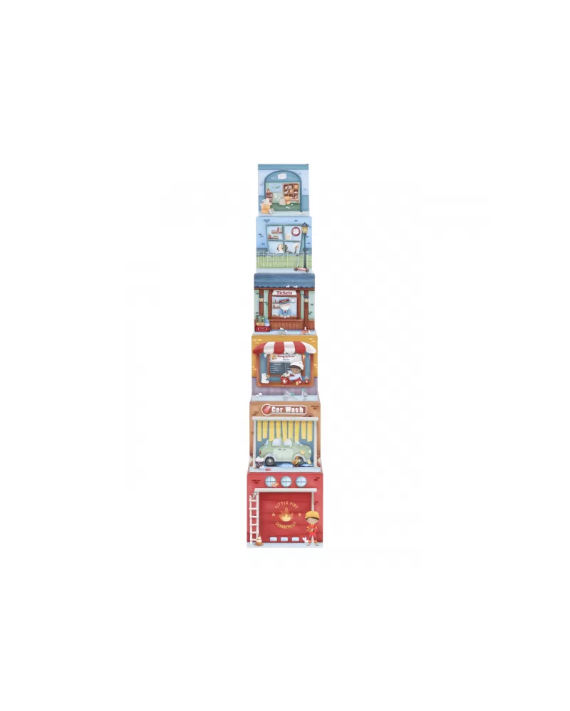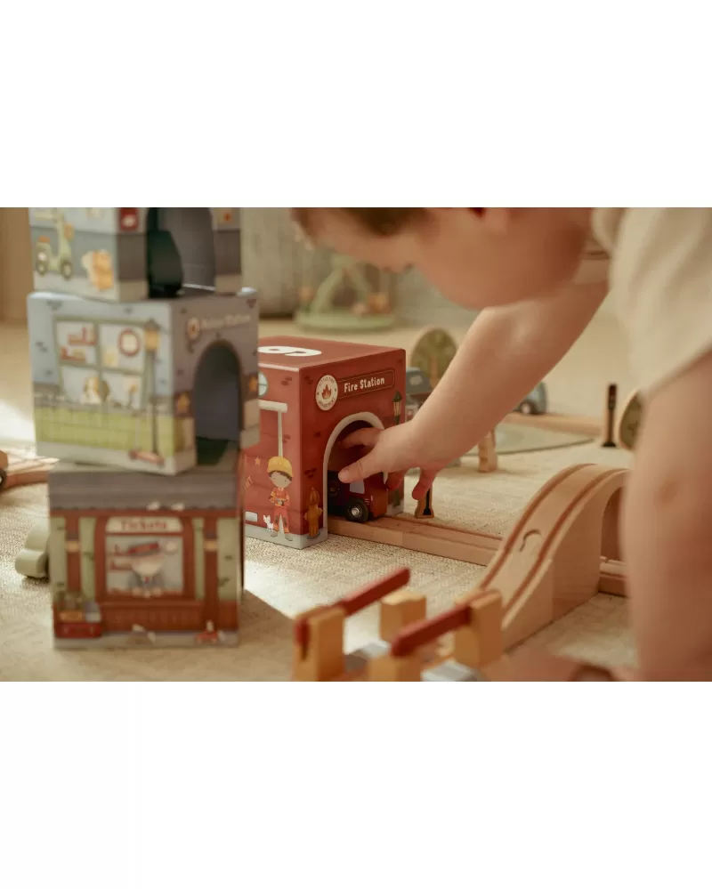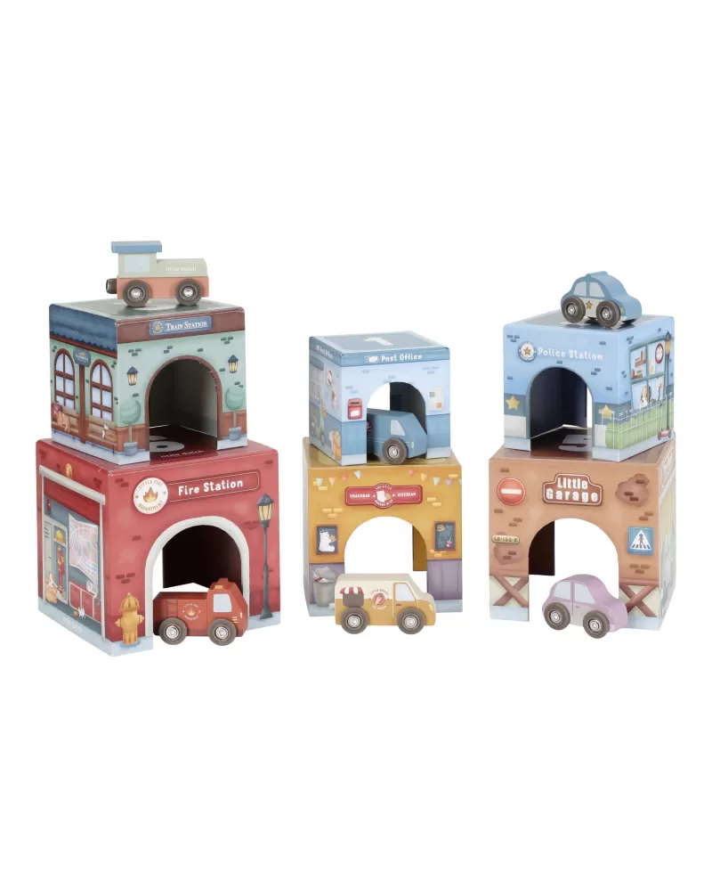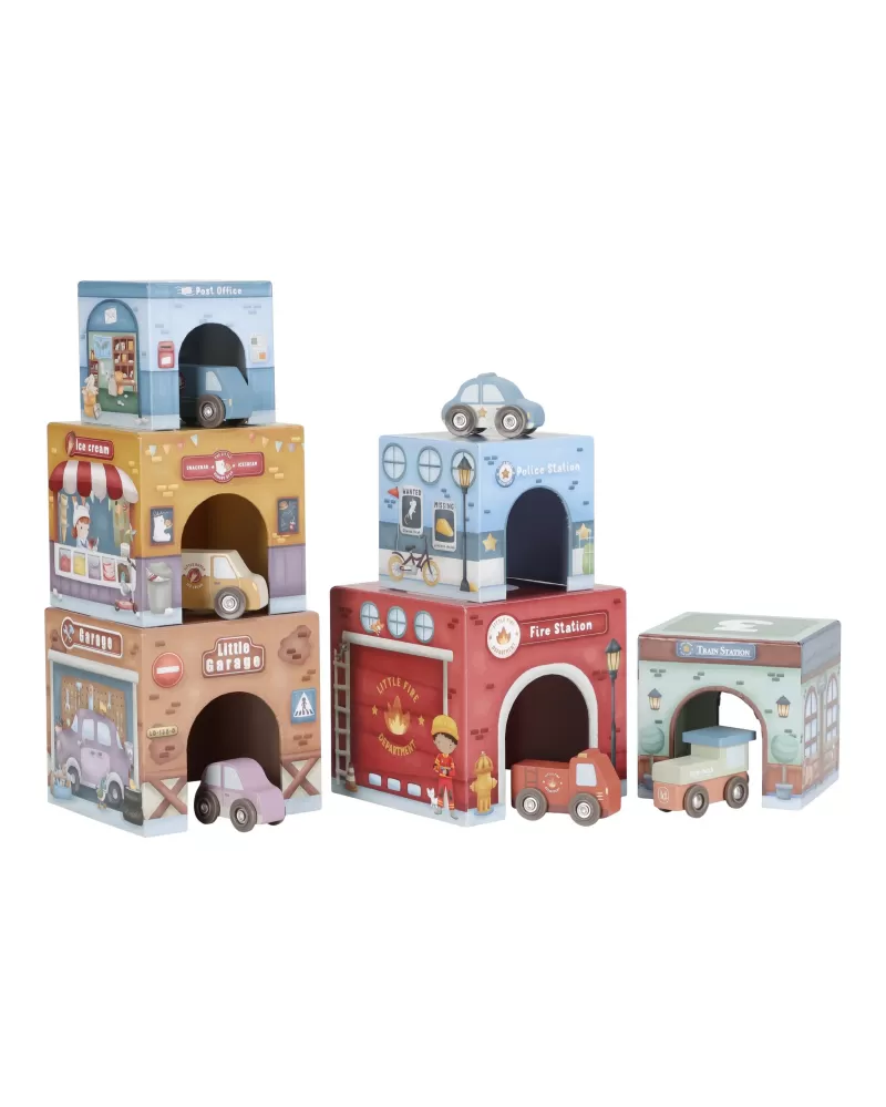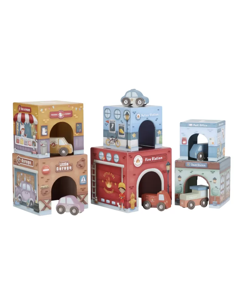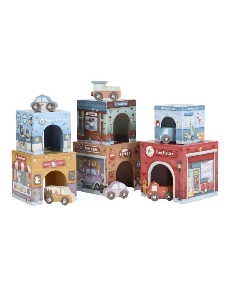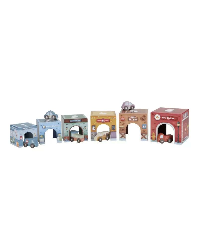 Stavět, objevovat a hrát si! Tato nápaditá sada Little Duch obsahuje šest ilustrovaných kartonových kostek různých velikostí, které představují budovy jako požární stanici, garáž nebo poštu – a k nim 6 dřevěných vozidel, patřících k jednotlivým budovám.