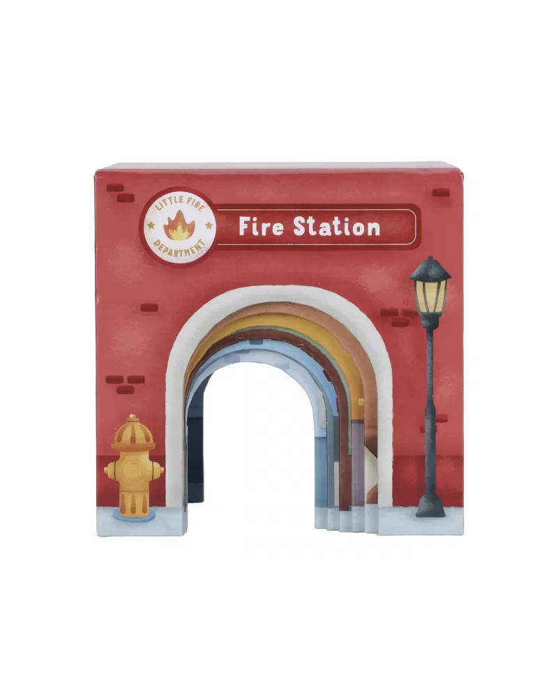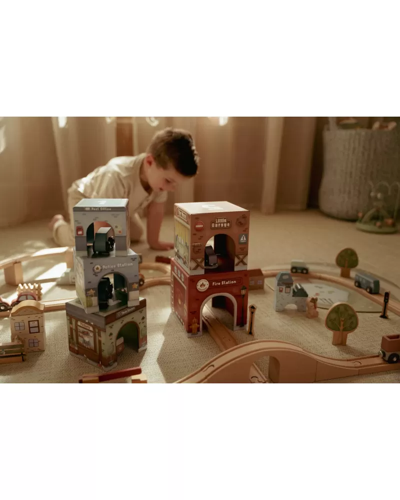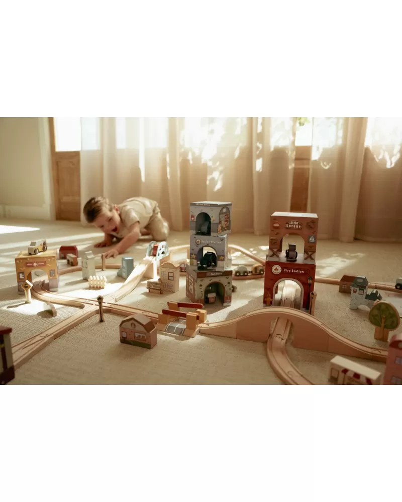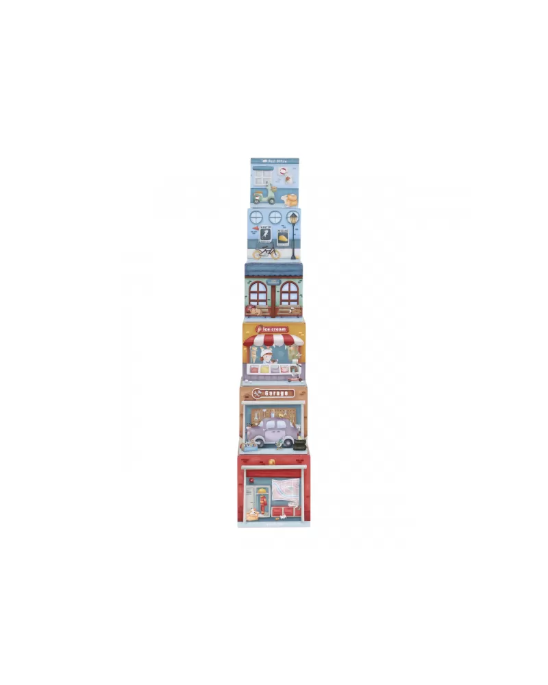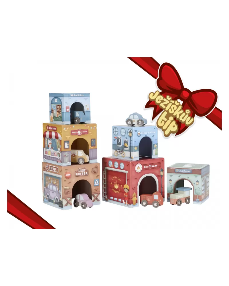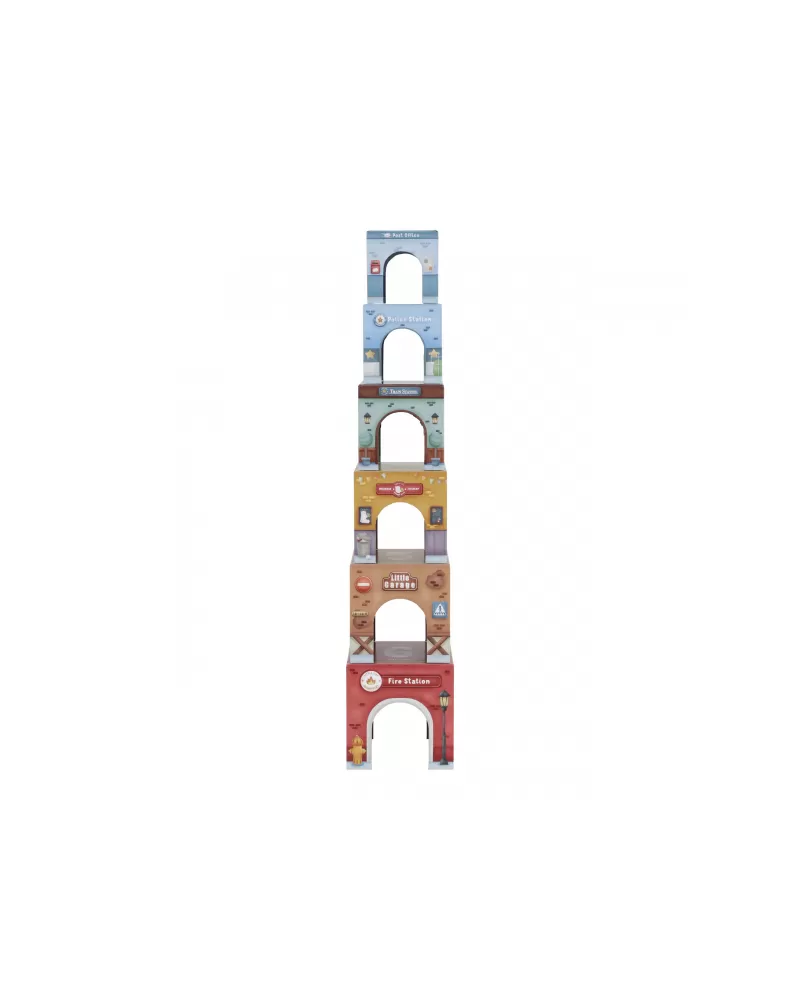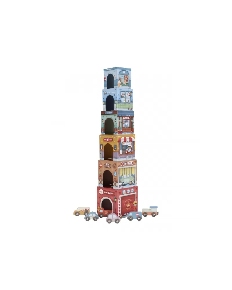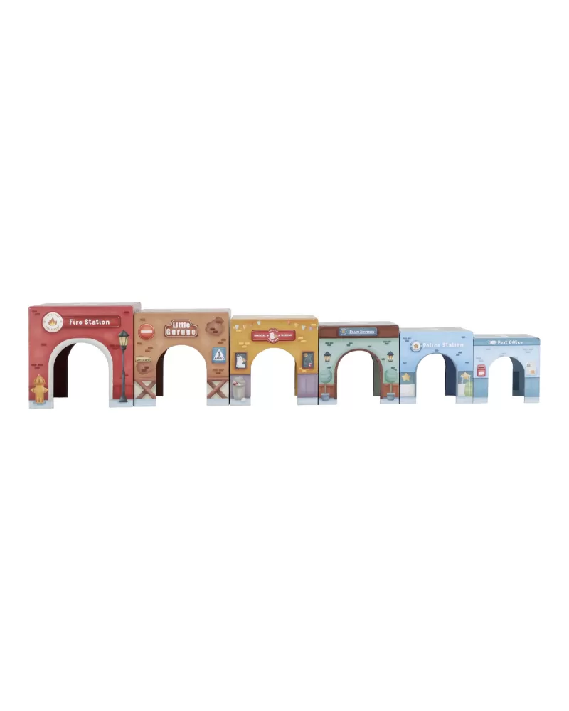 Stavět, objevovat a hrát si! Tato nápaditá sada Little Duch obsahuje šest ilustrovaných kartonových kostek různých velikostí, které představují budovy jako požární stanici, garáž nebo poštu – a k nim 6 dřevěných vozidel, patřících k jednotlivým budovám.