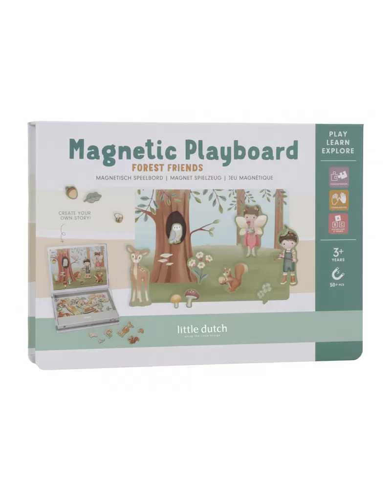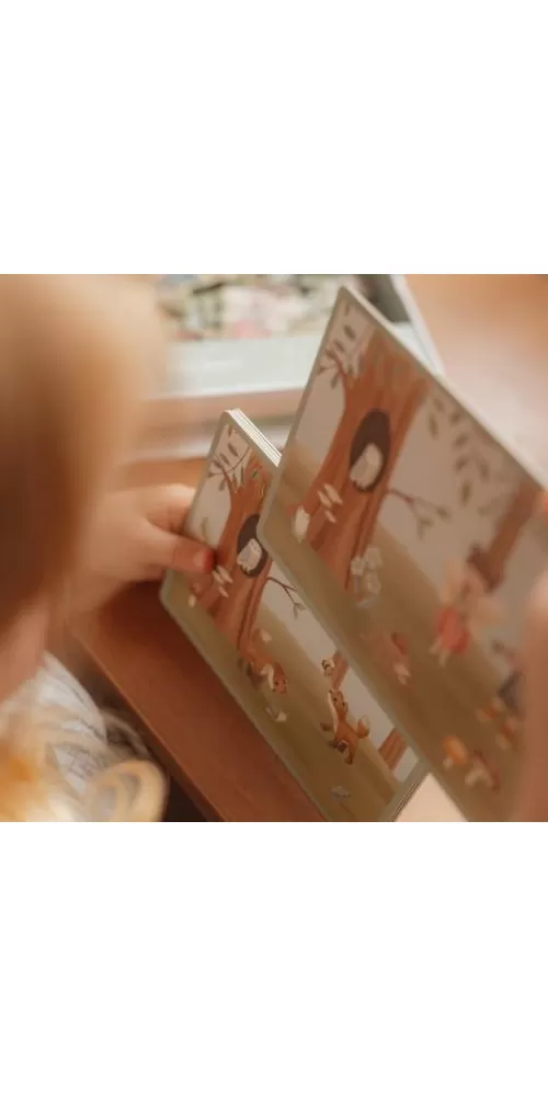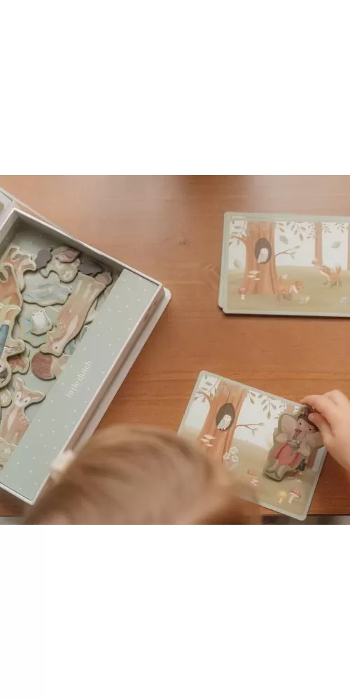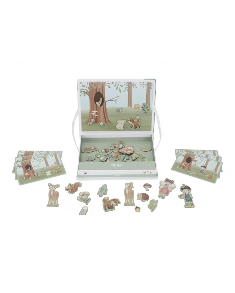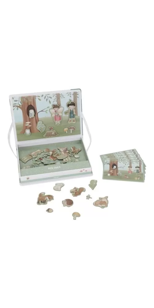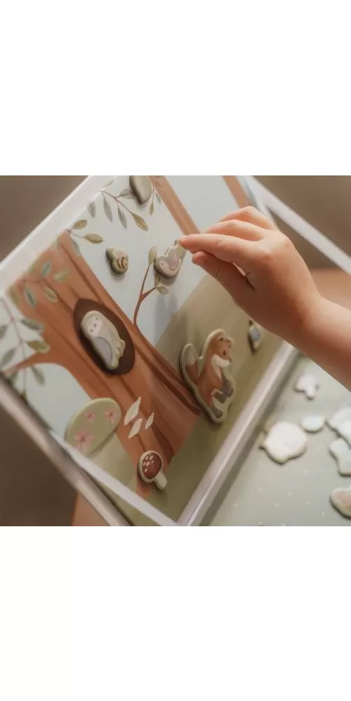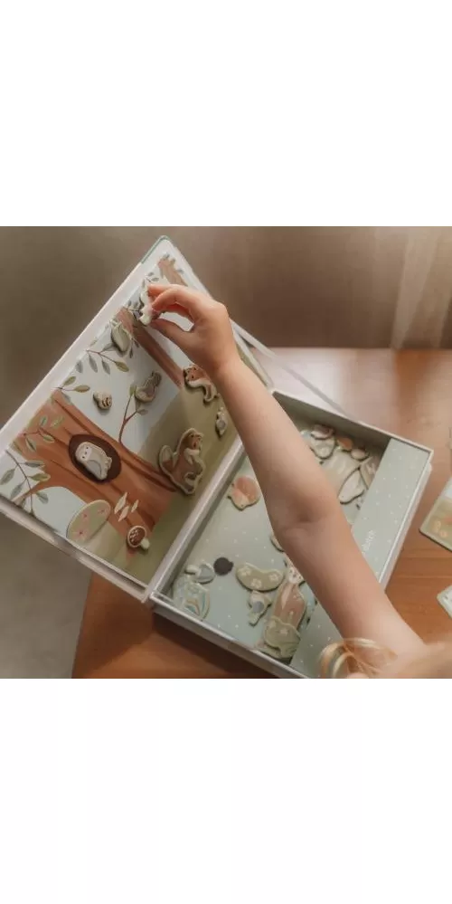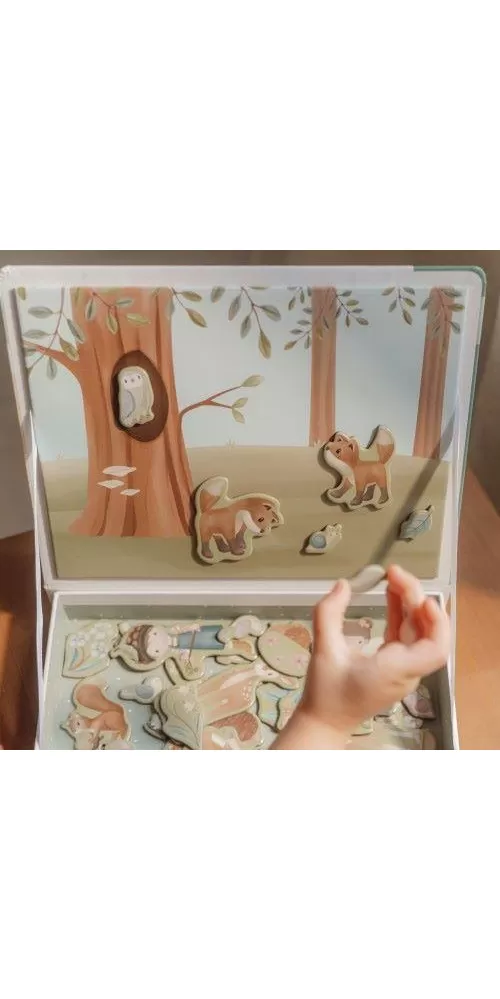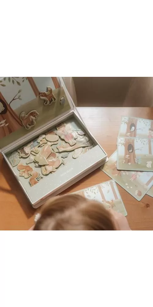 Magnetická hra se skládá z magnetických dílů s motivy ze života v lese a 6 vzorových karet. Magnetické víko lze použít jako herní desku.