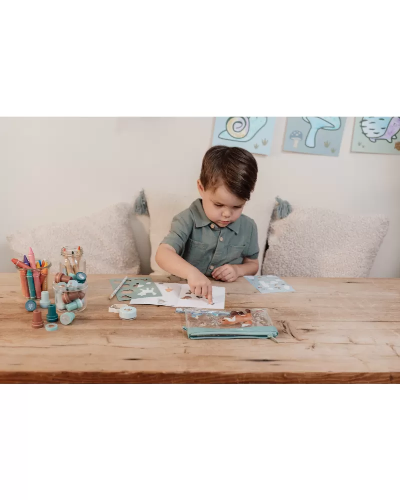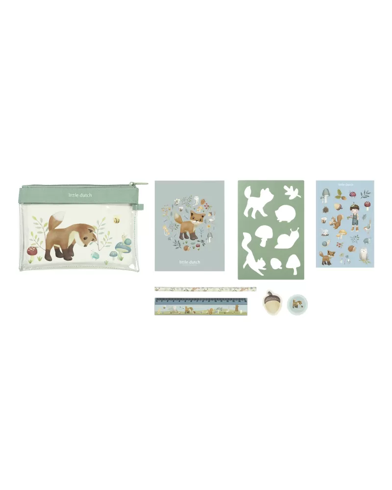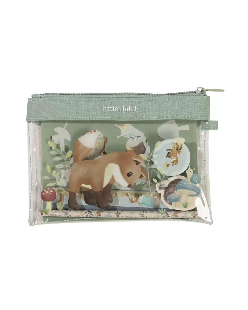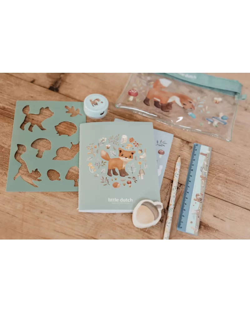 Sada výtvarných potřeb v krásném provedení s motivy života v lese obsahuje průhledné pouzdro na zip, sešit, samolepky, pravítko, gumu, ořezávátko a šablony.
