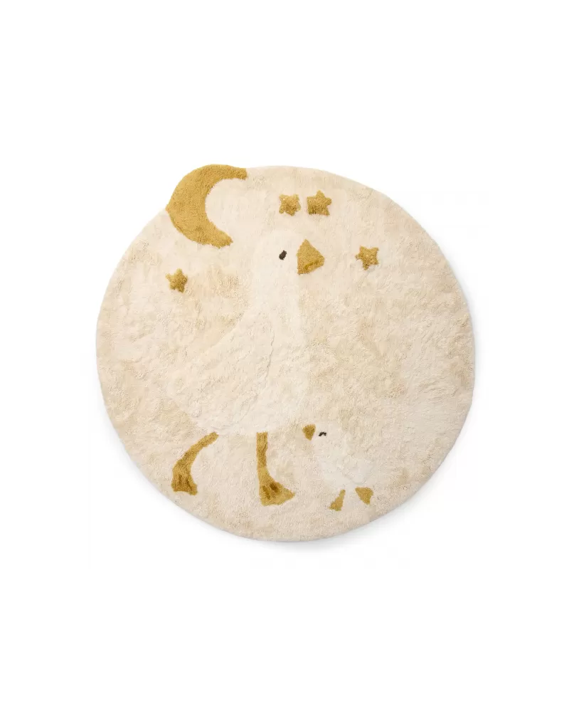 Kouzelný kulatý koberec s motivem husy a housátka, měsíce a hvězdiček promění každý pokojíček v místo plné pohody a snů. Je hebký, hřejivý a ideální pro hraní, odpočinek nebo čtení pohádek.