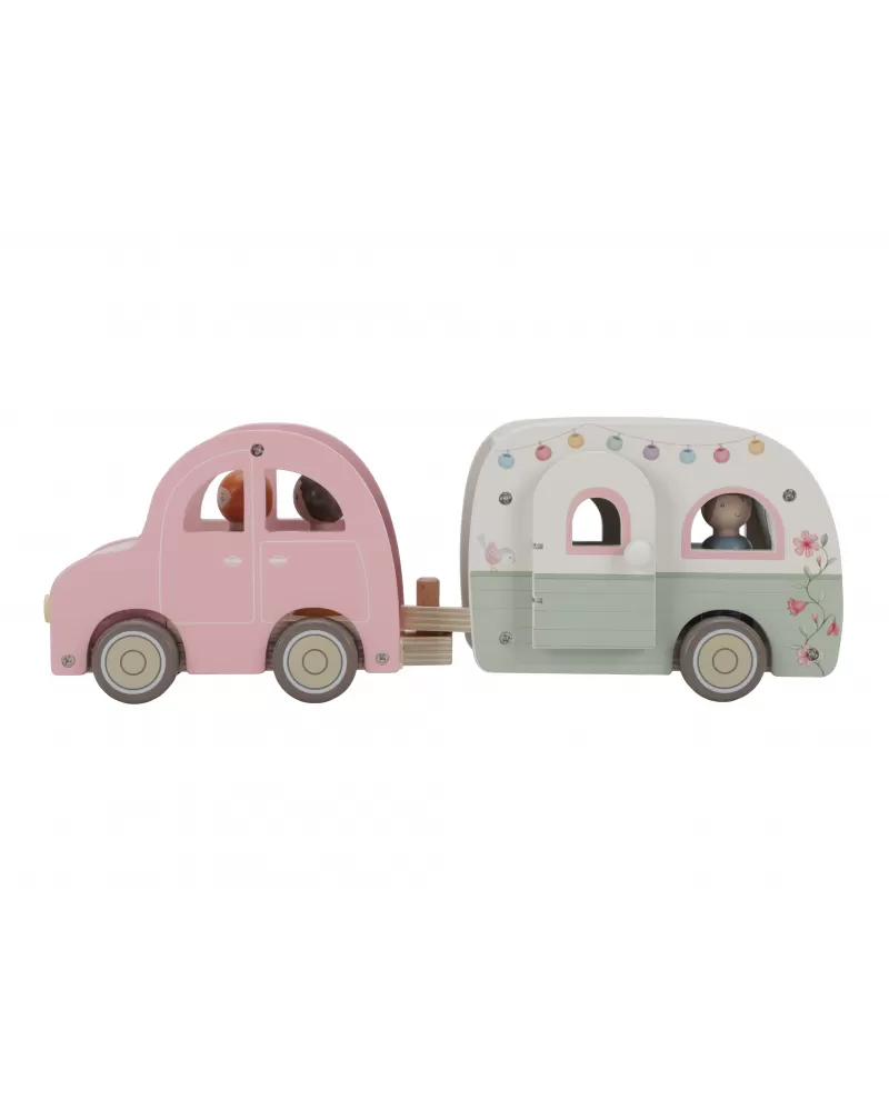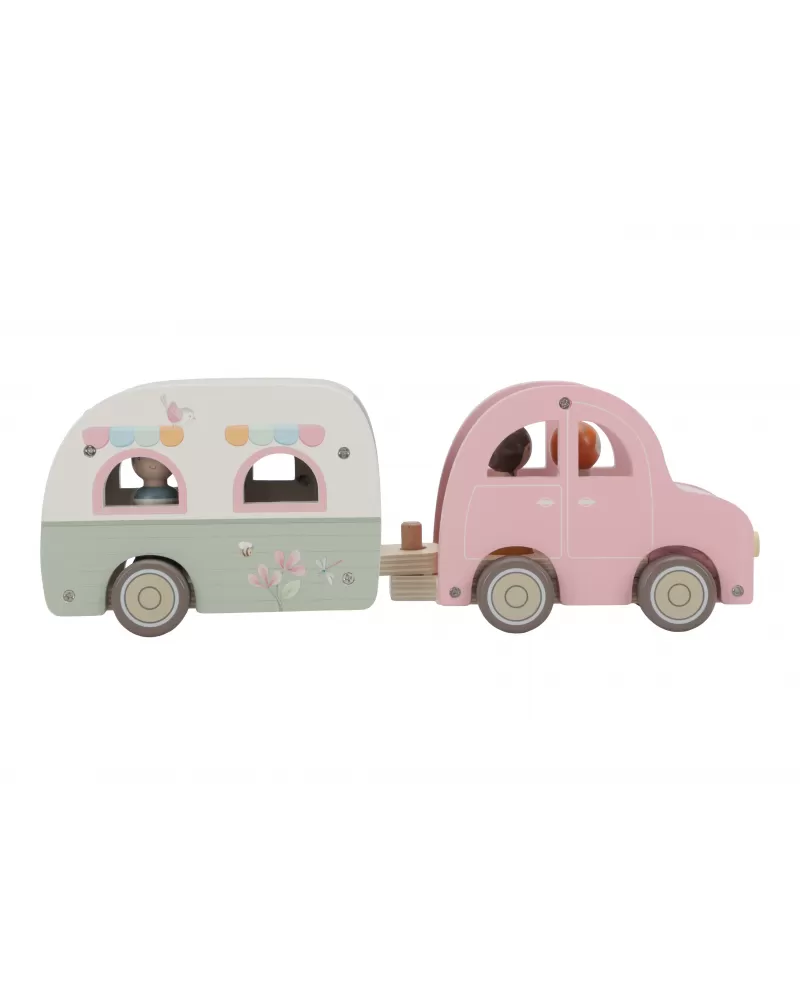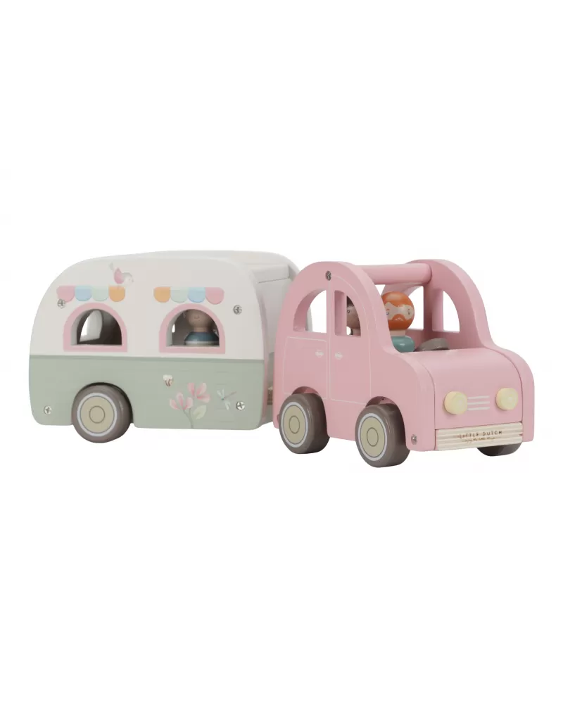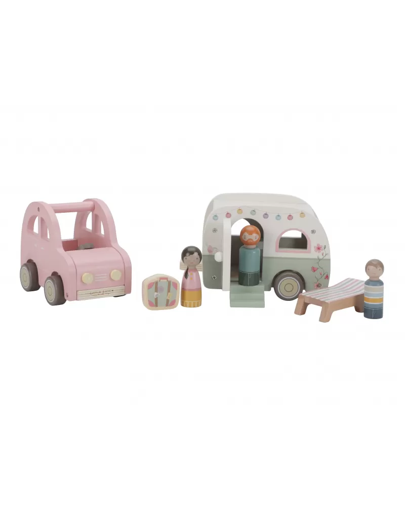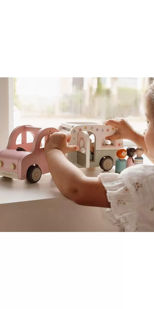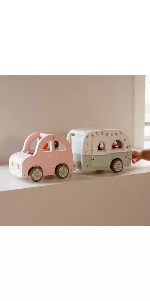 Roztomilé růžové auto s karavanem v kvalitním dřevěném provedení doveze celou rodinku za prázdninovým dobrodružstvím. Karavan má odnímatelnou střechu a otevírací dveře, aby bylo možné rodinku i vybavení dovnitř snadno umístit.