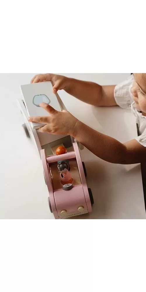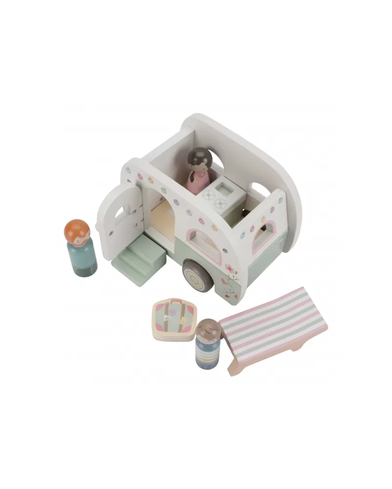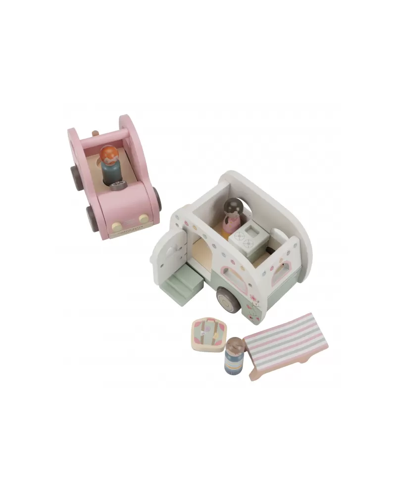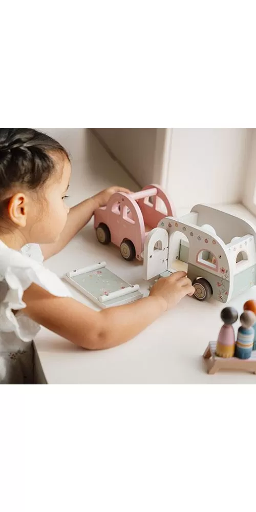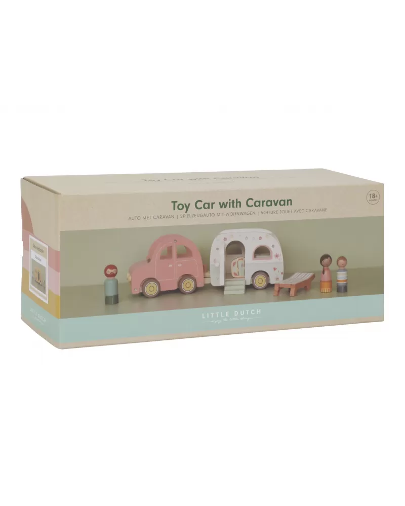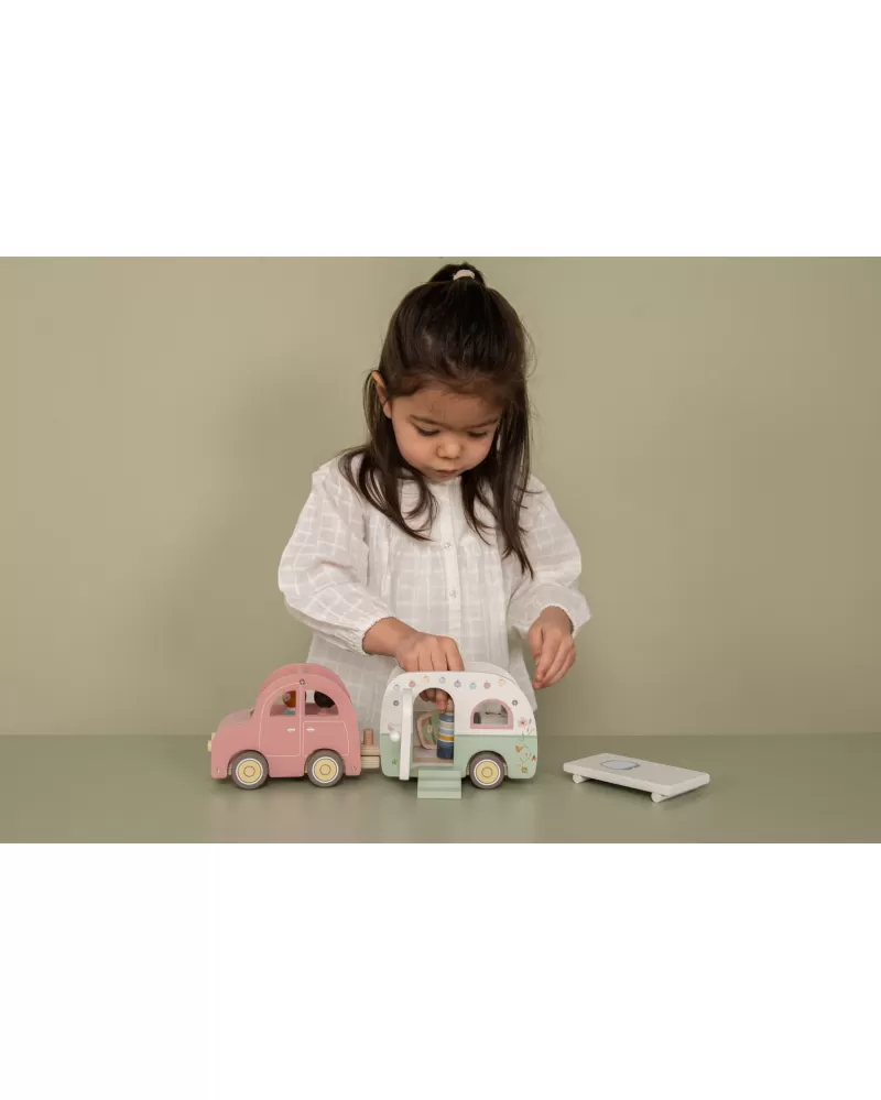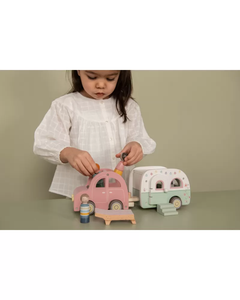 Roztomilé růžové auto s karavanem v kvalitním dřevěném provedení doveze celou rodinku za prázdninovým dobrodružstvím. Karavan má odnímatelnou střechu a otevírací dveře, aby bylo možné rodinku i vybavení dovnitř snadno umístit.