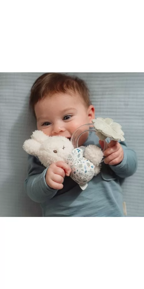 Roztomilý králíček z jemného plyše drží chrastítko s korálky, které vydává při pohybu jemný zvuk. Hračka podporuje rozvoj smyslů, zvídavosti a jemné motoriky dítěte.