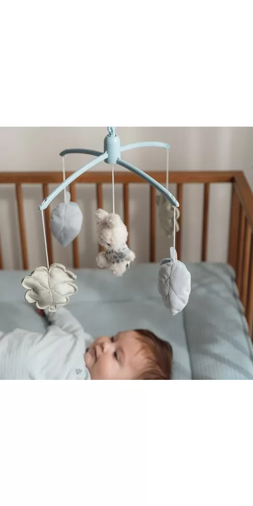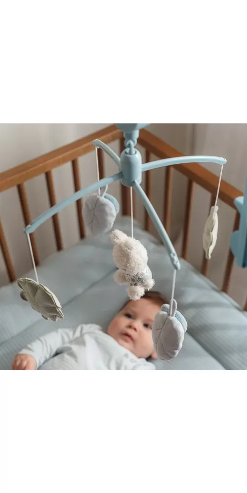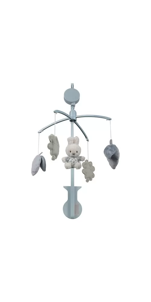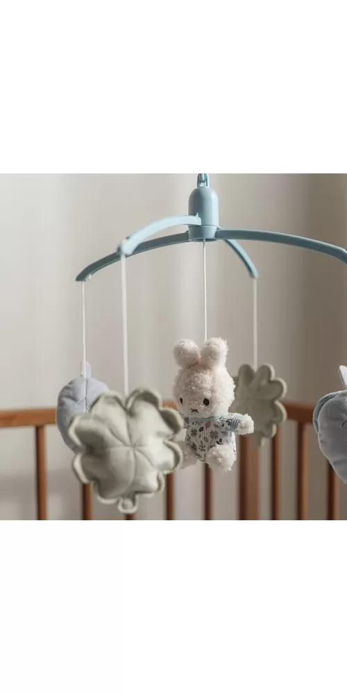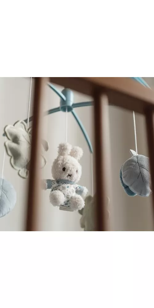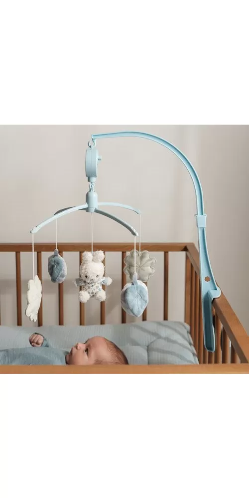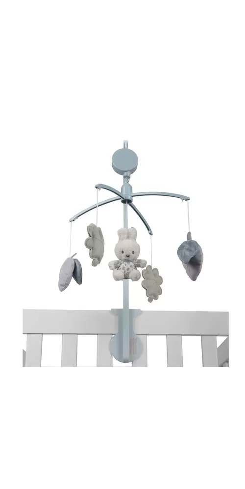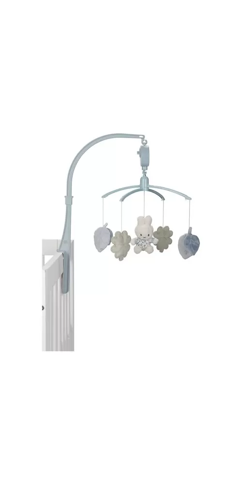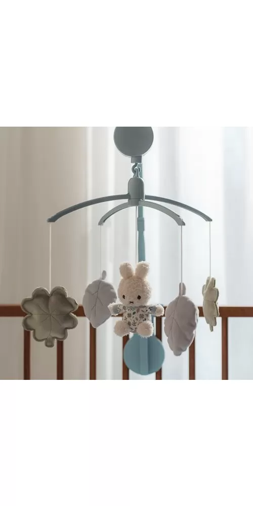 Kolotoč s natahovacím hudebním boxem hraje něžnou ukolébavku pro klidné usínání. Pozornost dítěte upoutají otáčející se plyšové hračky v podobě králíčka Miffy a listů různých tvarů v pastelových barvách. Kolotoč snadno připevníte na bočnici postýlky.