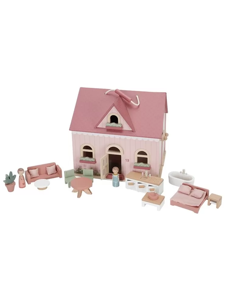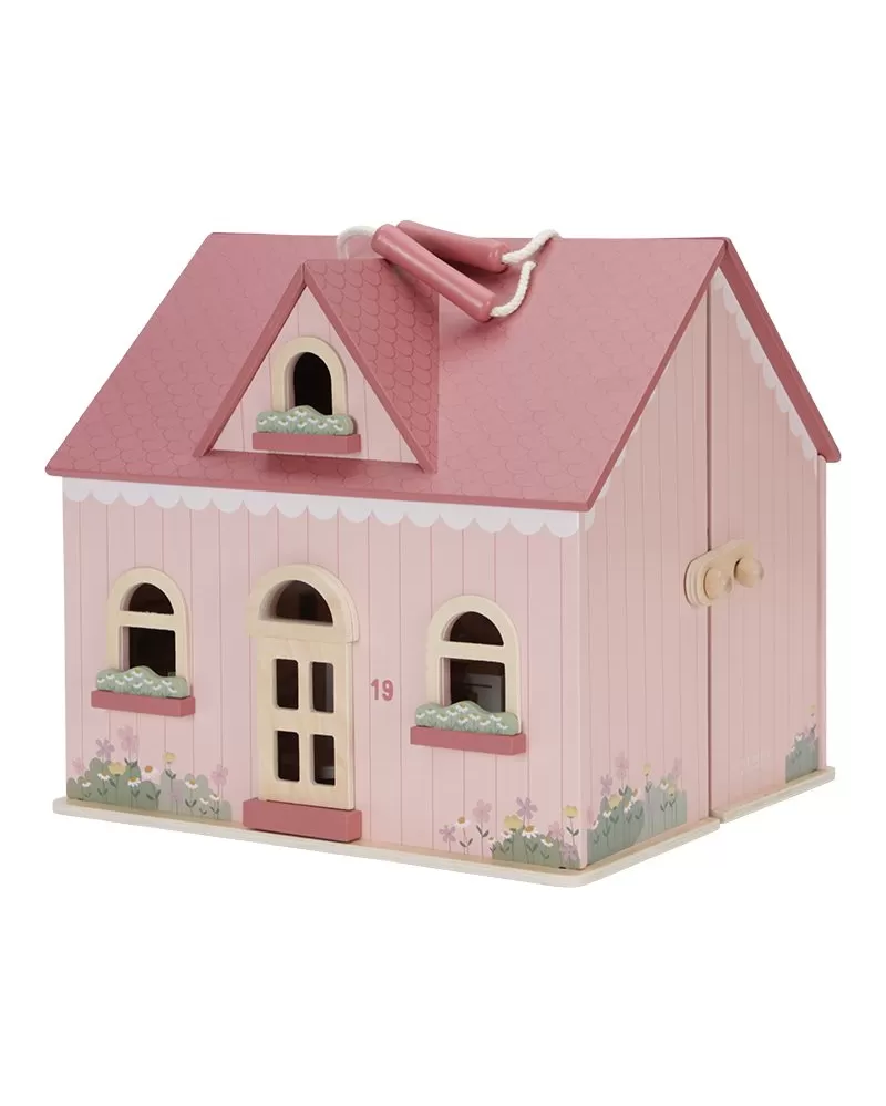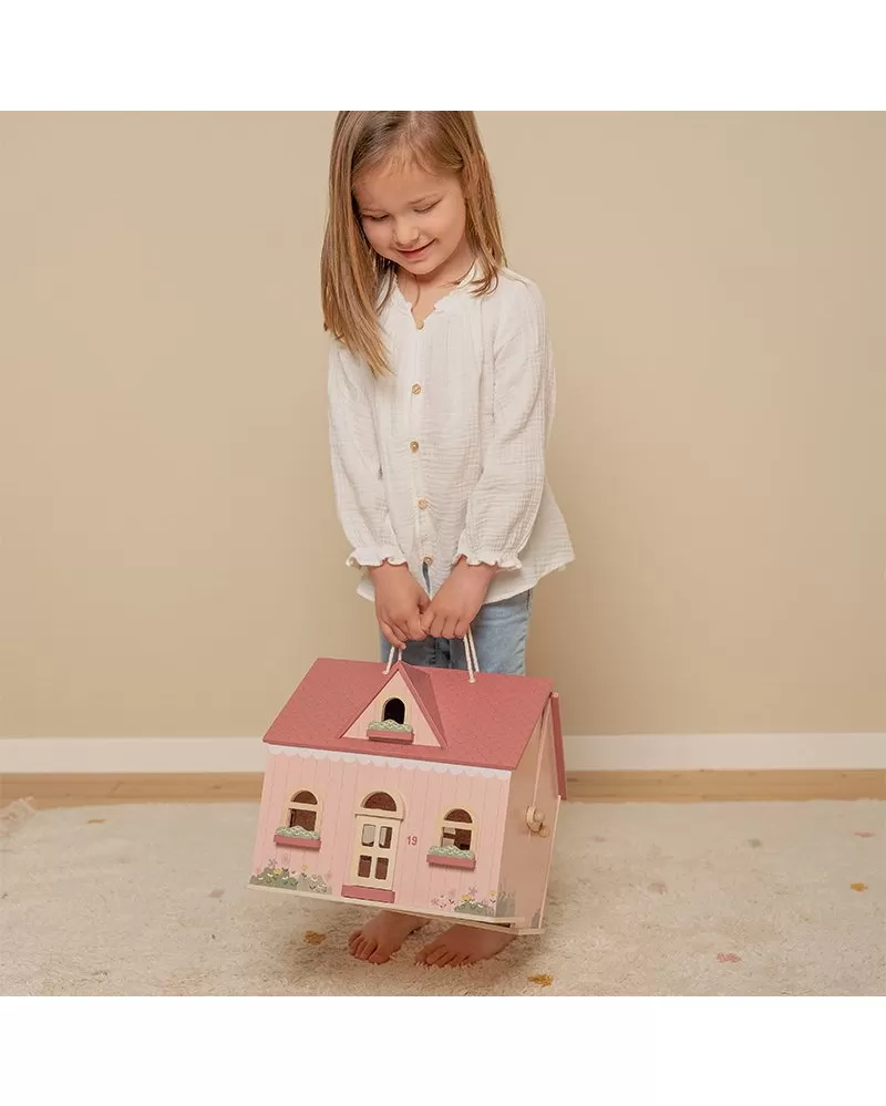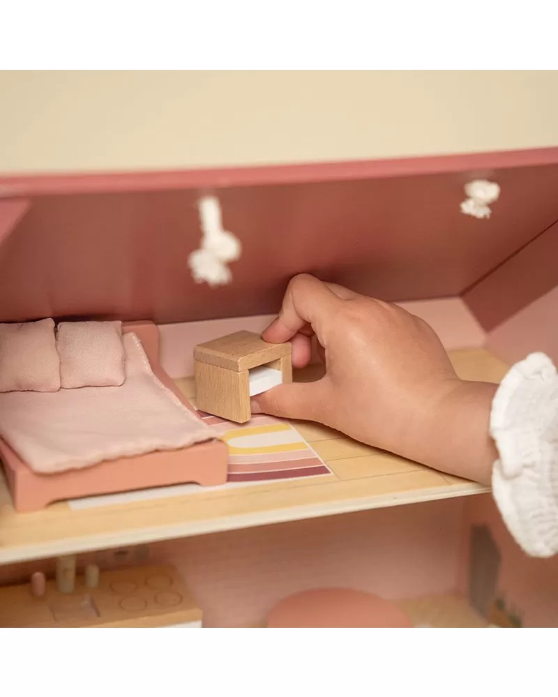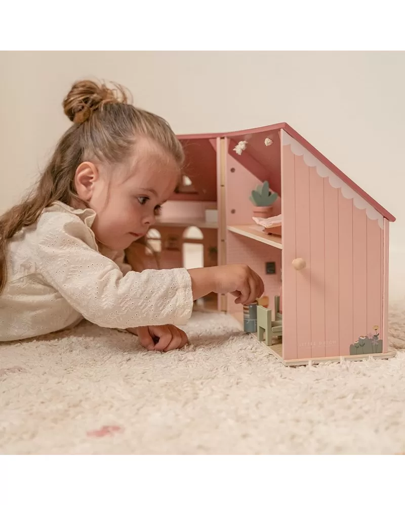 Roztomilý dřevěný domeček pro panenky Little Dutch má v přízemí obývací pokoj s kuchyní a v patře ložnici s koupelnou. Každý pokoj je zařízen odpovídajícím nábytkem a doplňky, součástí jsou i dvě dřevěné panenky Jim a Rosa. K domečku je možné dokoupit další sady nábytku, domází mazlíčky apod.