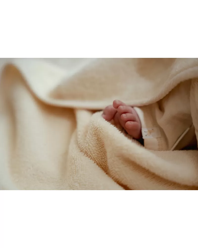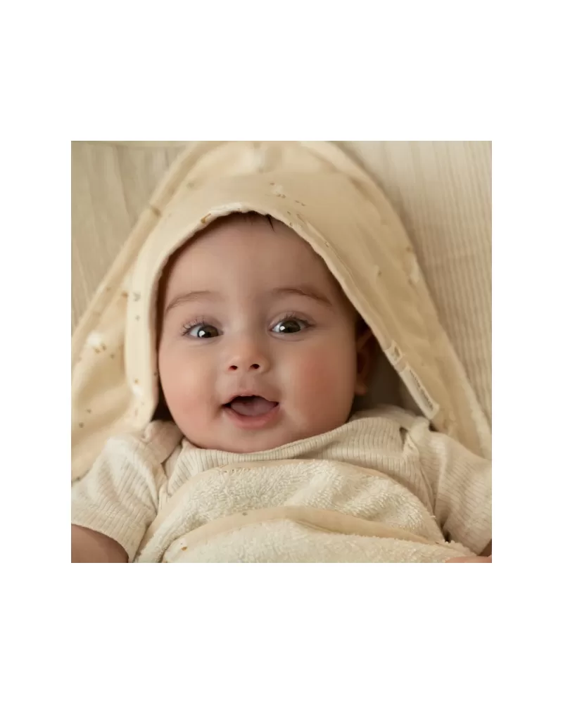 Měkká froté osuška s kapucí z jemné organické bavlny je ideální pro snadné a rychlé osušení a zabalení dítěte po koupeli.