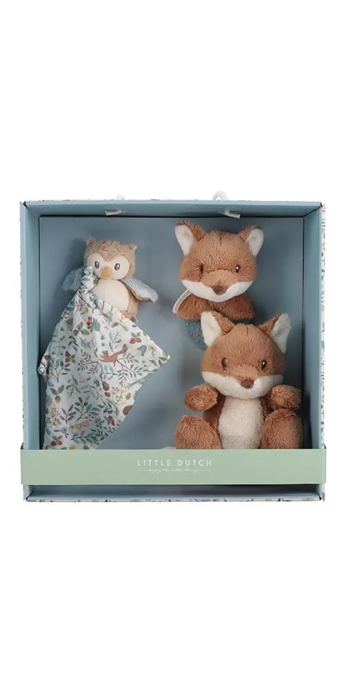 Krásná dárková sada plyšových hraček je ideální jako dárek pro novorozené miminko. Sada obsahuje kousátko s liškou, muchláčka se sovou a plyšovou lišku.