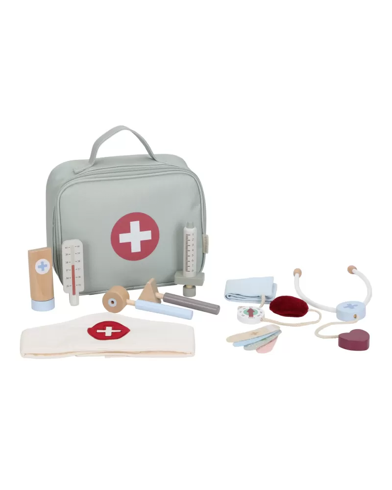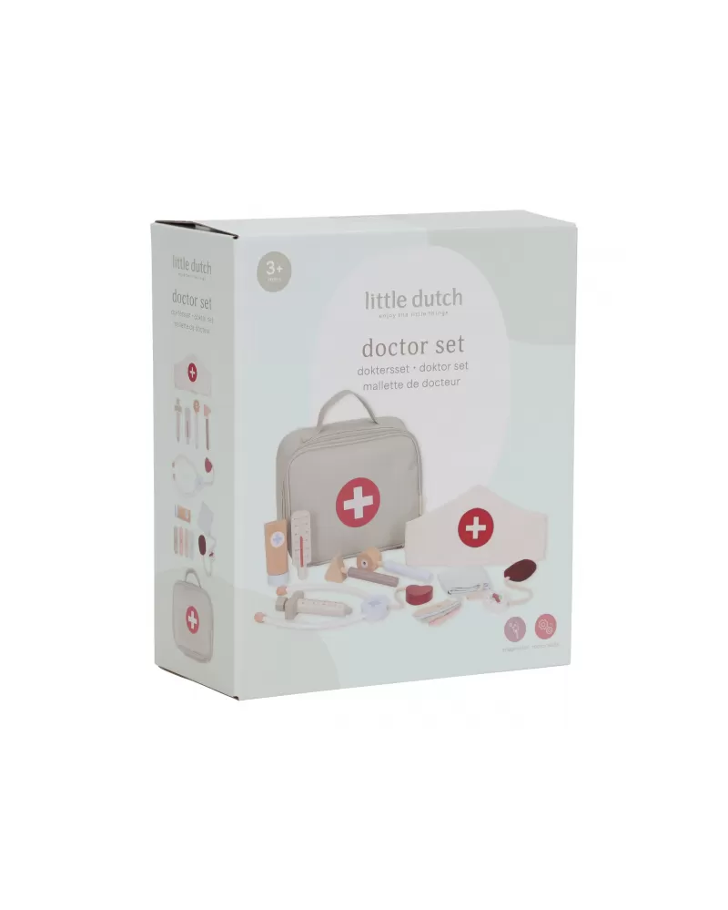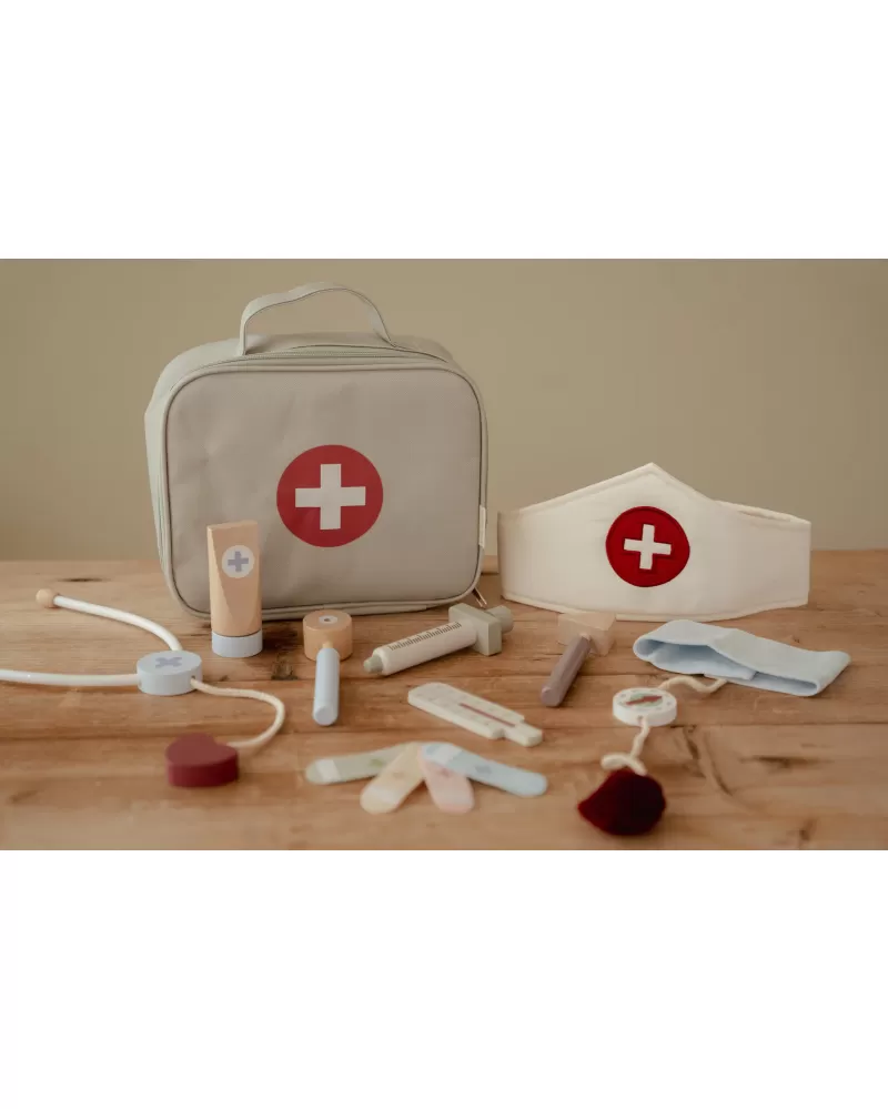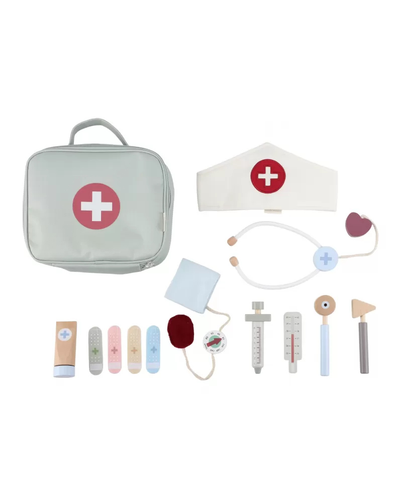 Paní doktorko, pane doktore – mohl/a byste se na mě podívat? S touto krásnou dřevěnou doktorskou sadou bude vaše dítě připravené postarat se o každého pacienta. Textilní lékařská taška ukrývá veškeré základní vybavení: teploměr, injekci, obvazy, stetoskop, tlakoměr a dokonce i doktorskou čepici.