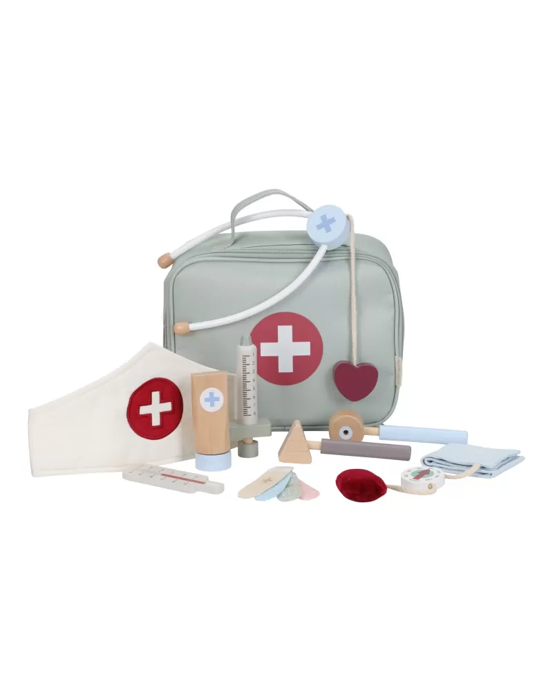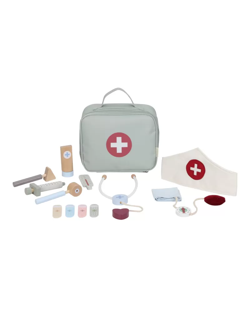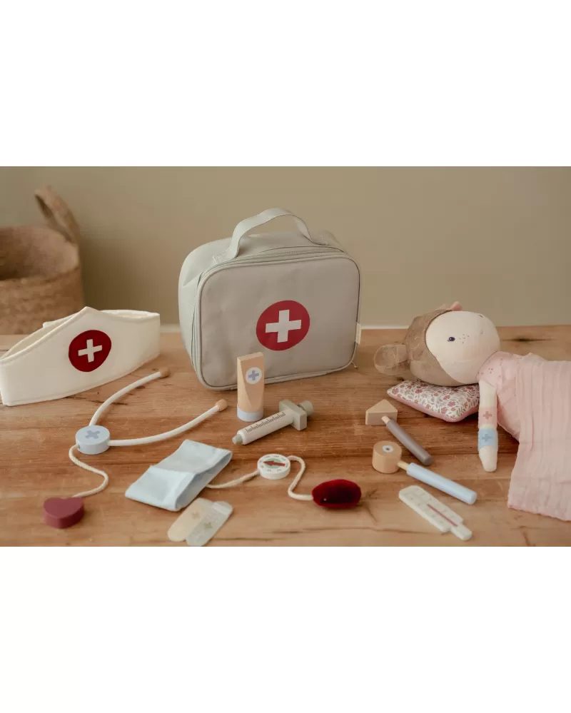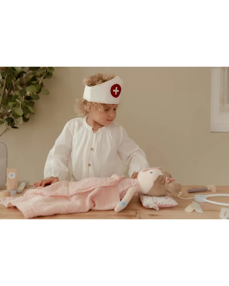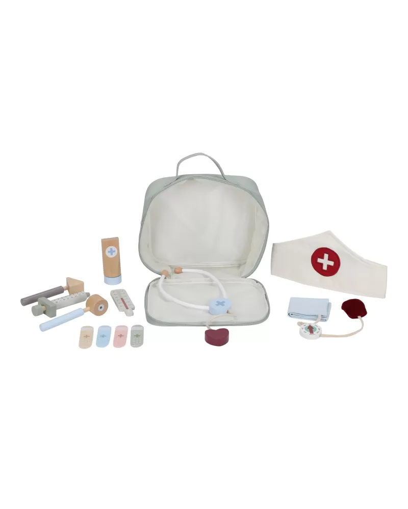 Paní doktorko, pane doktore – mohl/a byste se na mě podívat? S touto krásnou dřevěnou doktorskou sadou bude vaše dítě připravené postarat se o každého pacienta. Textilní lékařská taška ukrývá veškeré základní vybavení: teploměr, injekci, obvazy, stetoskop, tlakoměr a dokonce i doktorskou čepici.