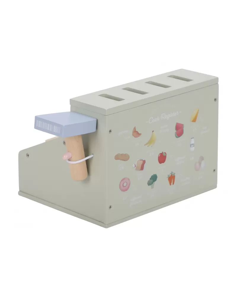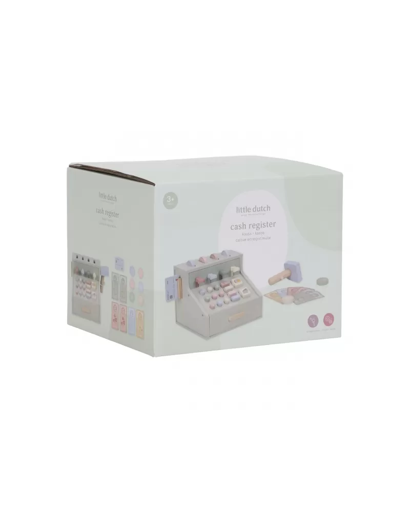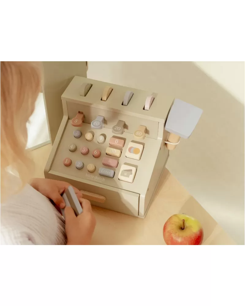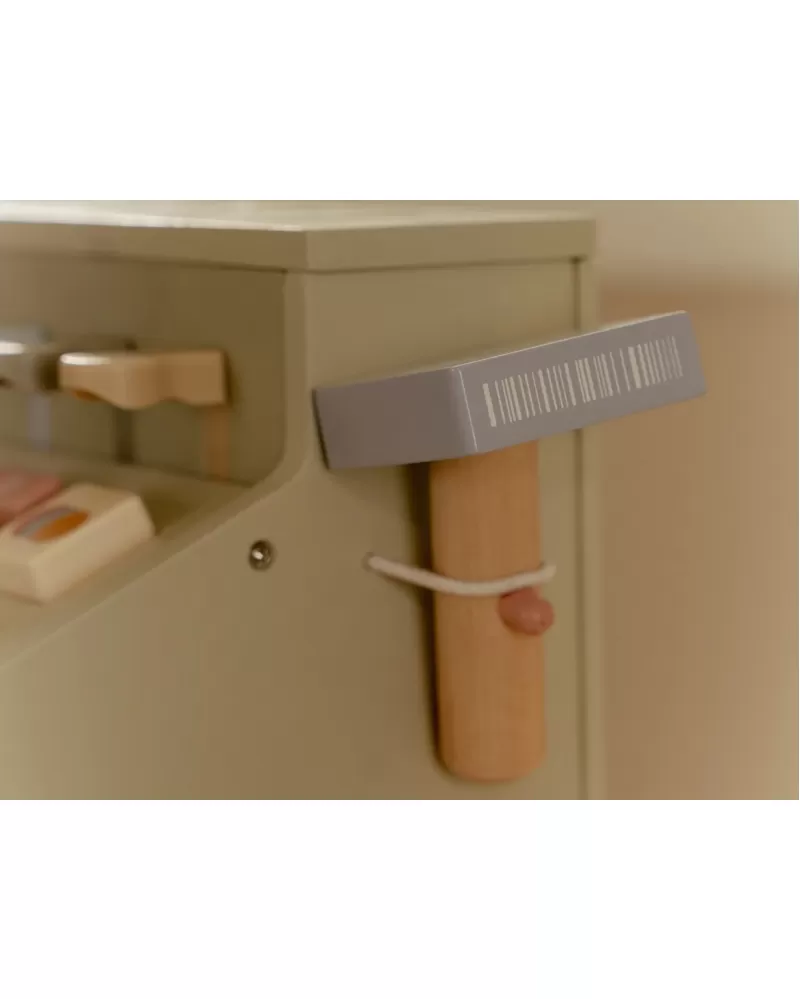 Počítej, skenuj a markuj! S touto krásnou dřevěnou pokladnou bude hra na obchod ještě zábavnější a realističtější. Pokladna je vybavena skenerem, čtečkou karet, tlačítky a zásuvkou na mince a bankovky. Součástí je i platební karta, takže malí prodavači mohou přijímat hotovost i bezkontaktní platby.