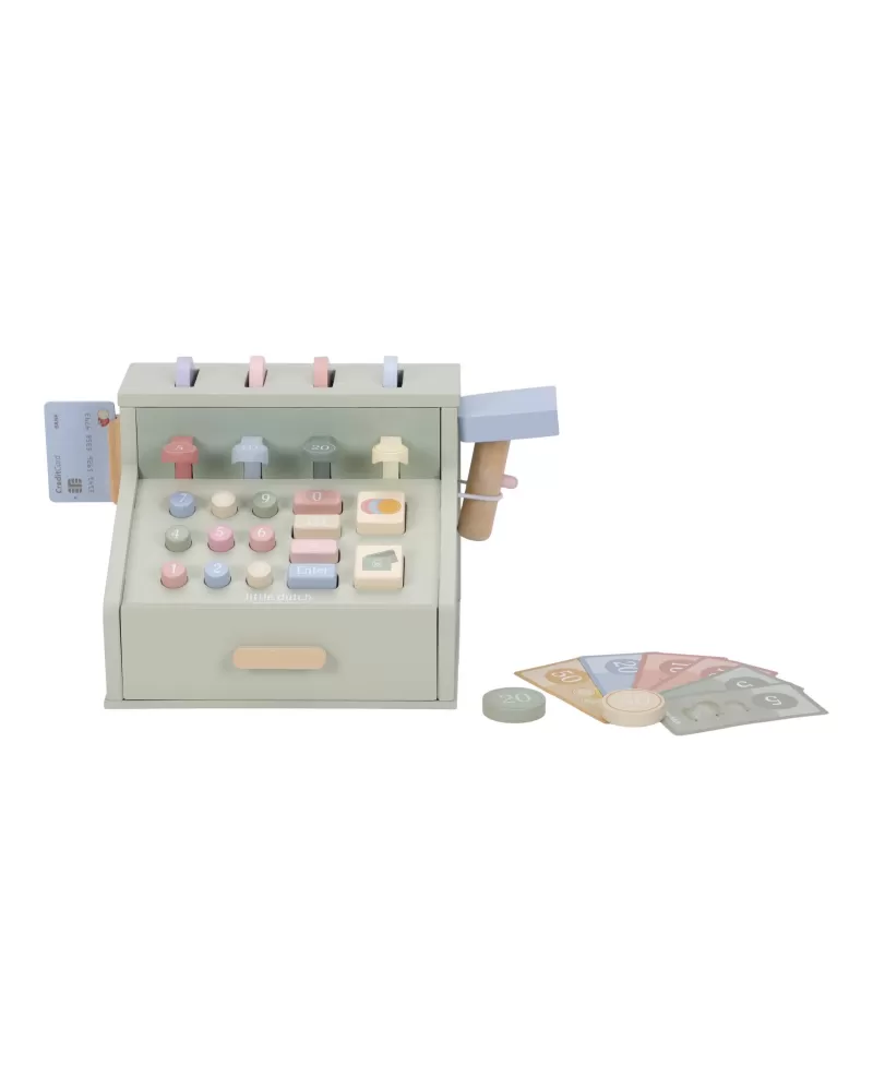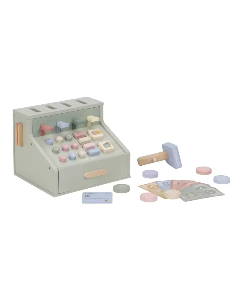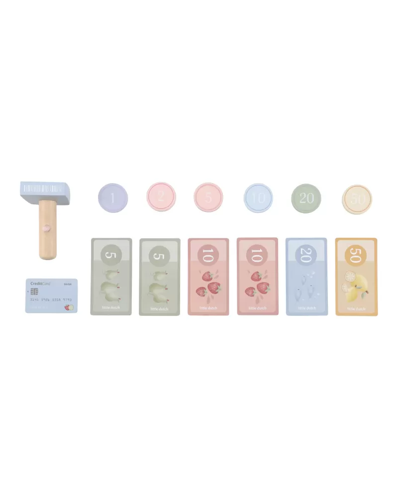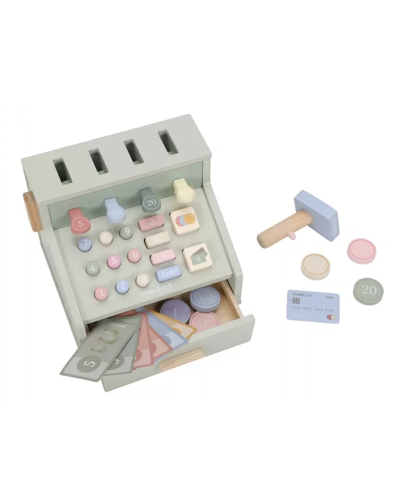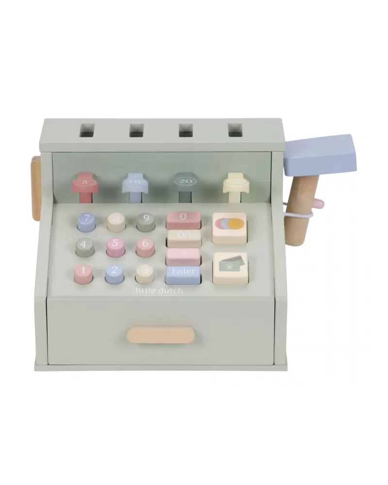 Počítej, skenuj a markuj! S touto krásnou dřevěnou pokladnou bude hra na obchod ještě zábavnější a realističtější. Pokladna je vybavena skenerem, čtečkou karet, tlačítky a zásuvkou na mince a bankovky. Součástí je i platební karta, takže malí prodavači mohou přijímat hotovost i bezkontaktní platby.