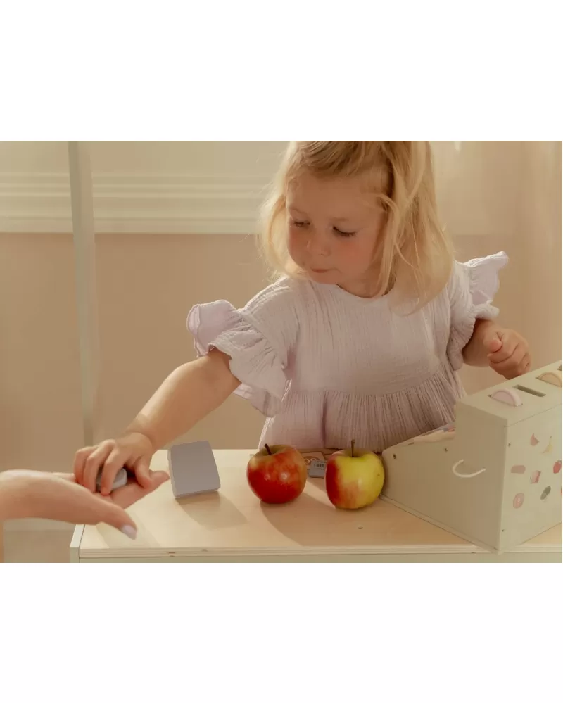 Děti si mohou procvičit základní počty a rozvíjet finanční gramotnost hrou, zatímco obsluhují zákazníky, skenují zboží a vystavují účtenky. Ideální doplněk k dalším dřevěným herním sadám, jako je kávovar, čajová souprava nebo dětský obchůdek.