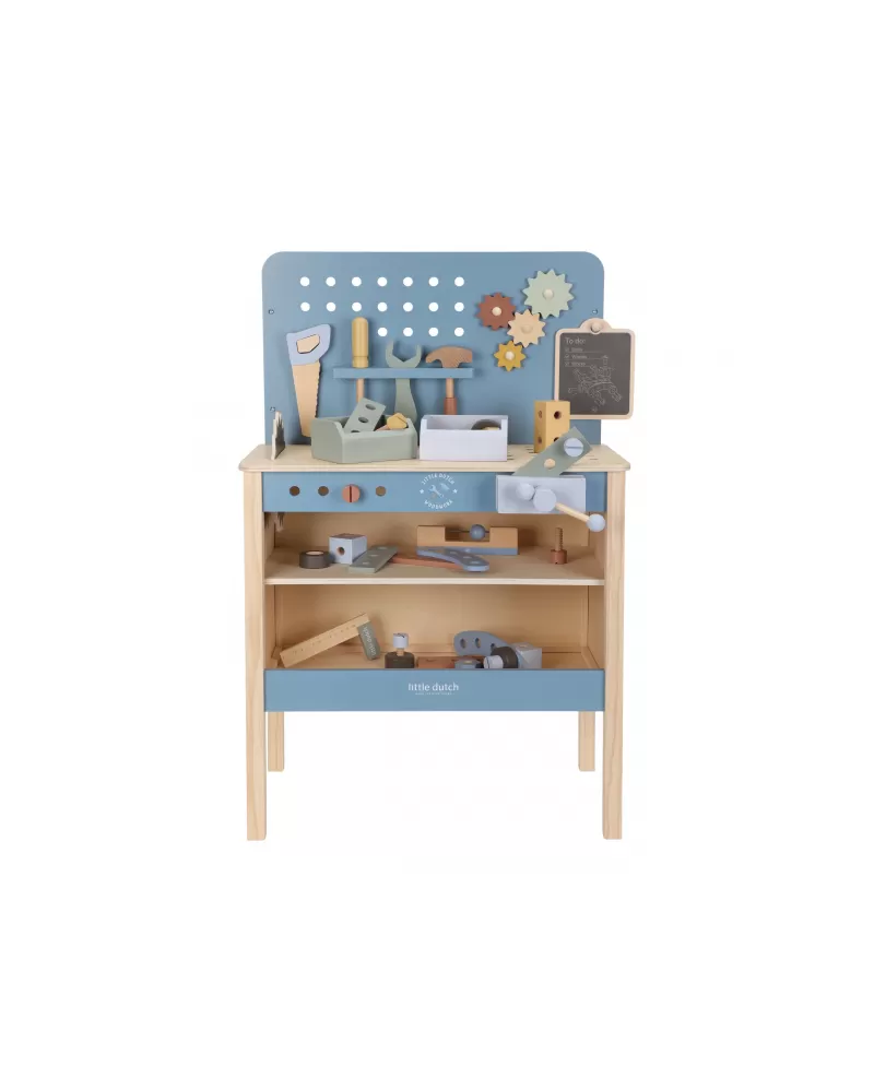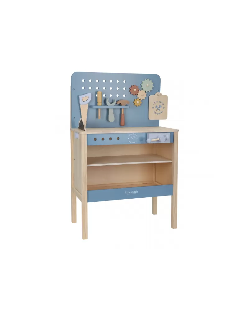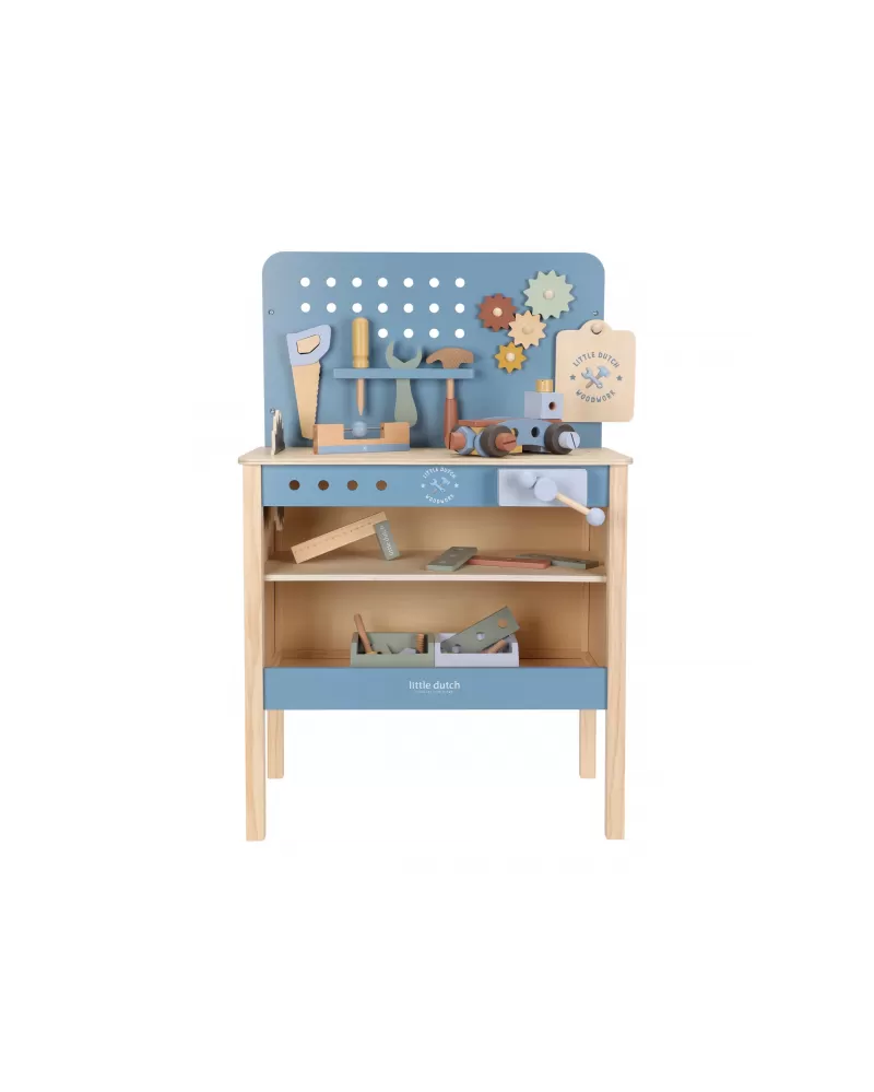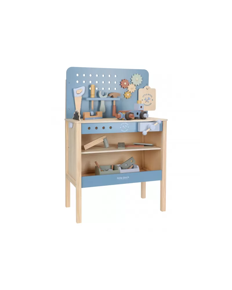 Dětský ponk pro malé kutily v kvalitním dřevěném provedení s nářadím a dalším příslušenstvím. Děti si mohou z jednotlivých dílů sestavit třeba autíčko nebo opravit, cokoli je potřeba. Součástí bohatého příslušenství je dětské kladívko, klíč, šroubovák, pilka, vodováha, metr, matice a šrouby.