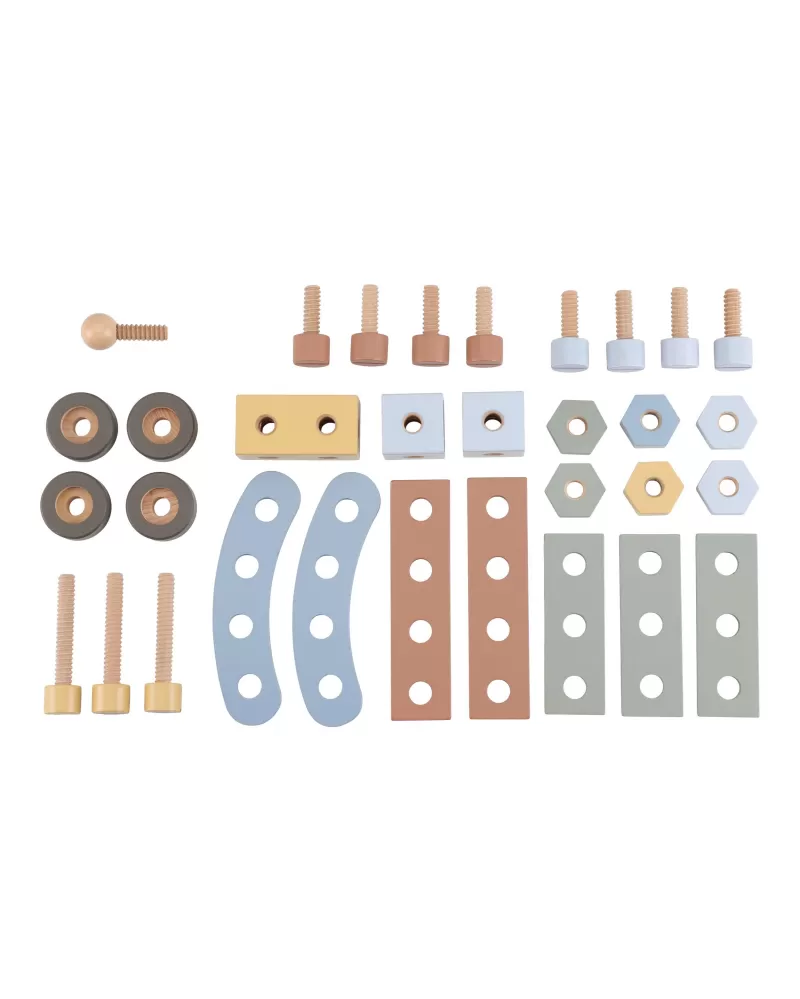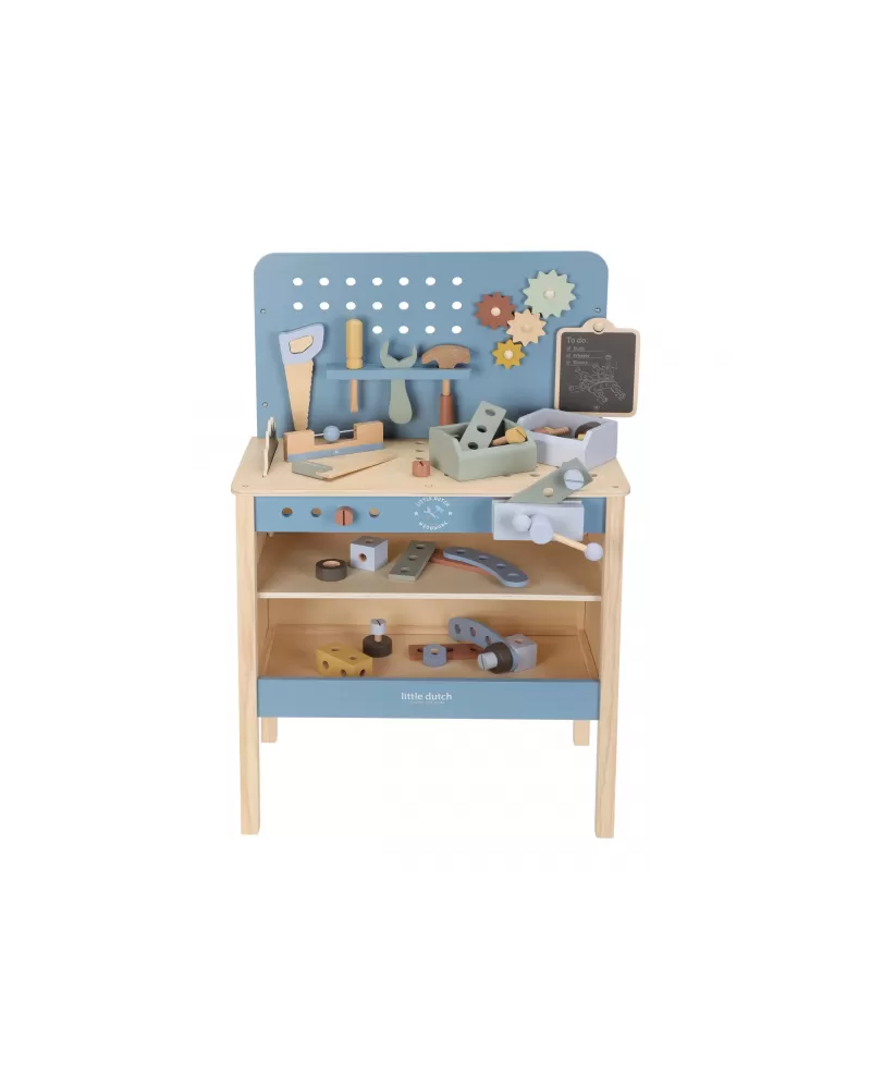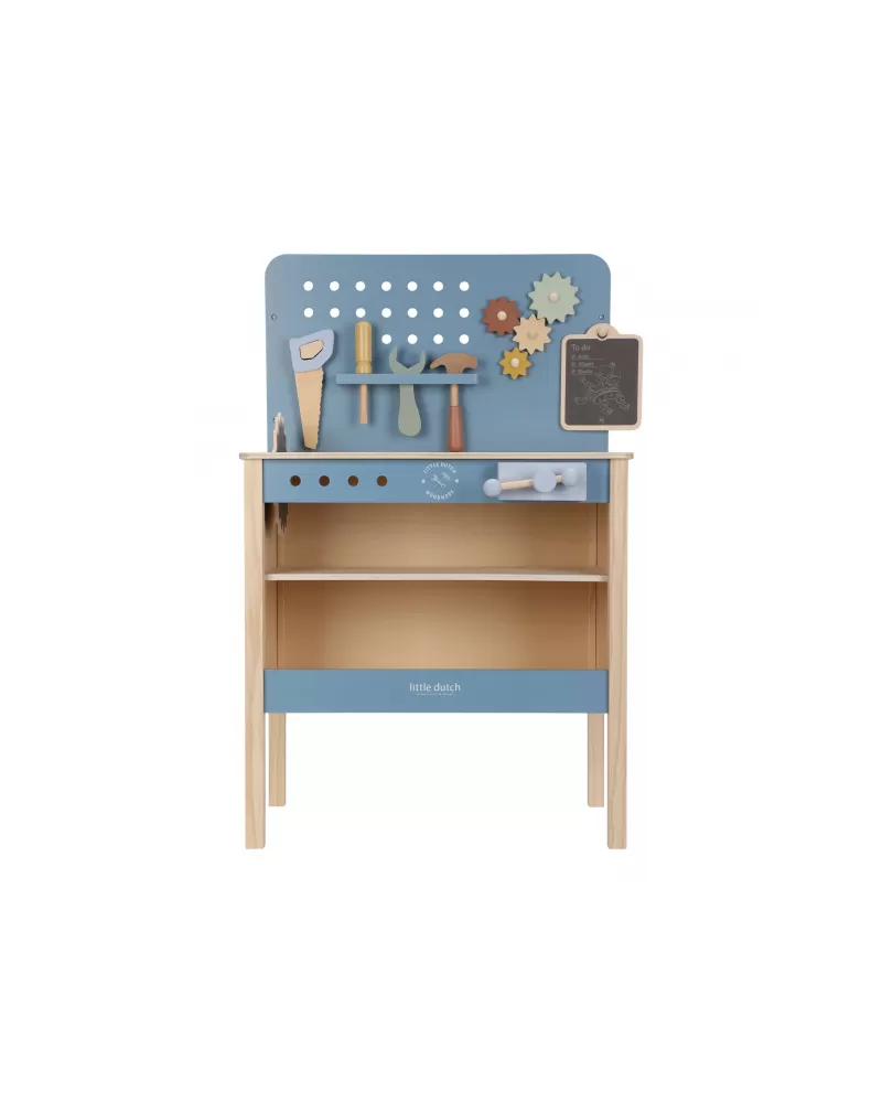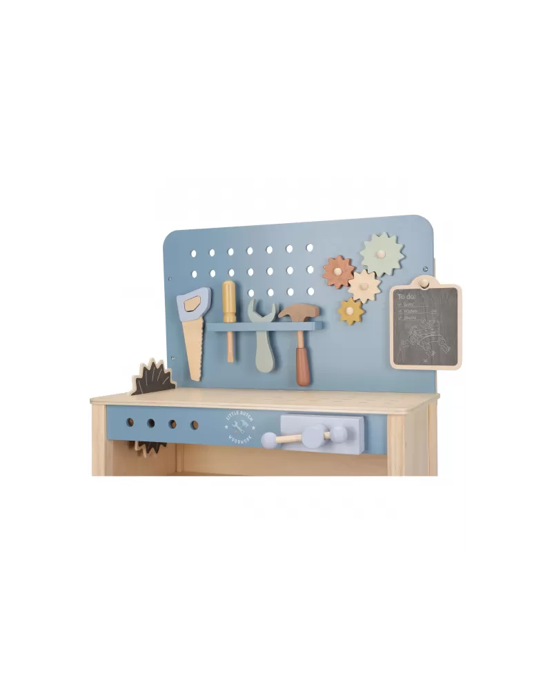 Dětský ponk pro malé kutily v kvalitním dřevěném provedení s nářadím a dalším příslušenstvím. Děti si mohou z jednotlivých dílů sestavit třeba autíčko nebo opravit, cokoli je potřeba. Součástí bohatého příslušenství je dětské kladívko, klíč, šroubovák, pilka, vodováha, metr, matice a šrouby.