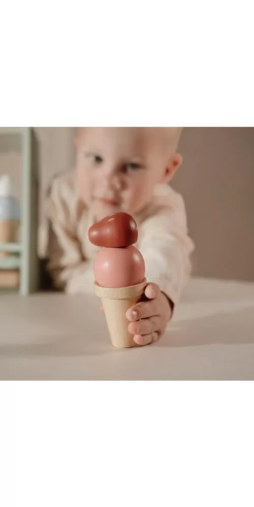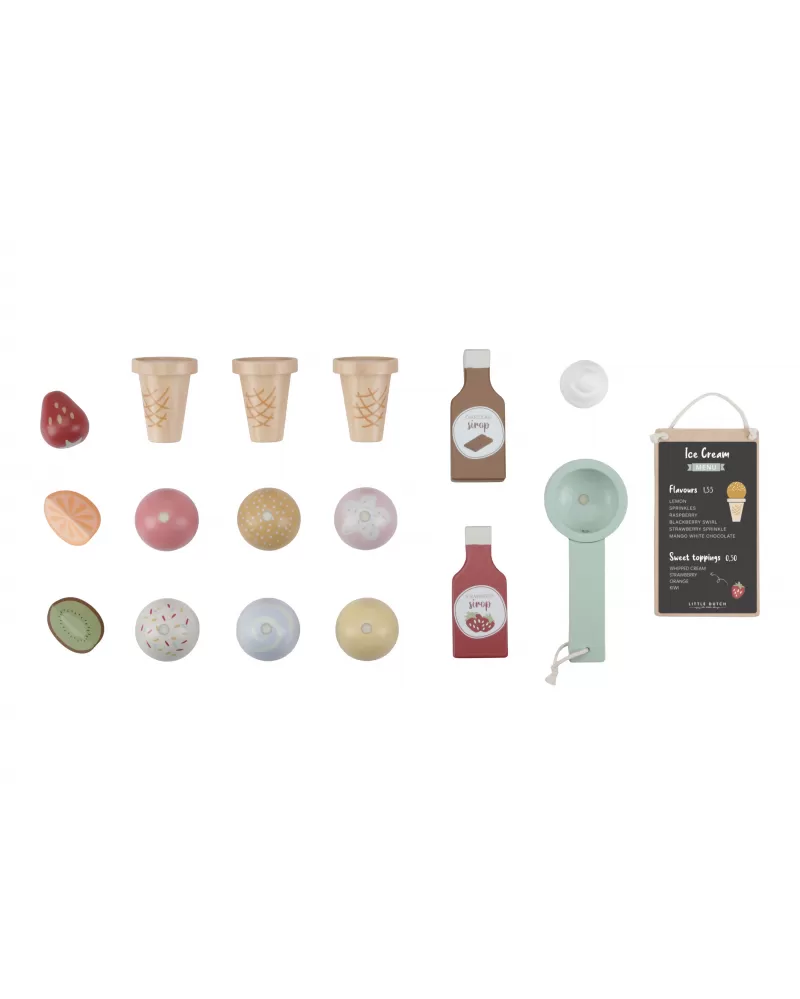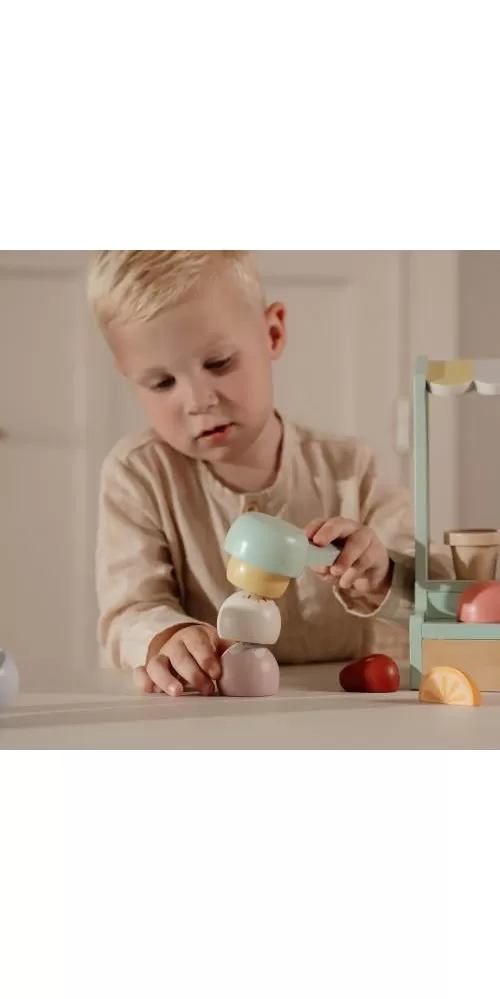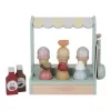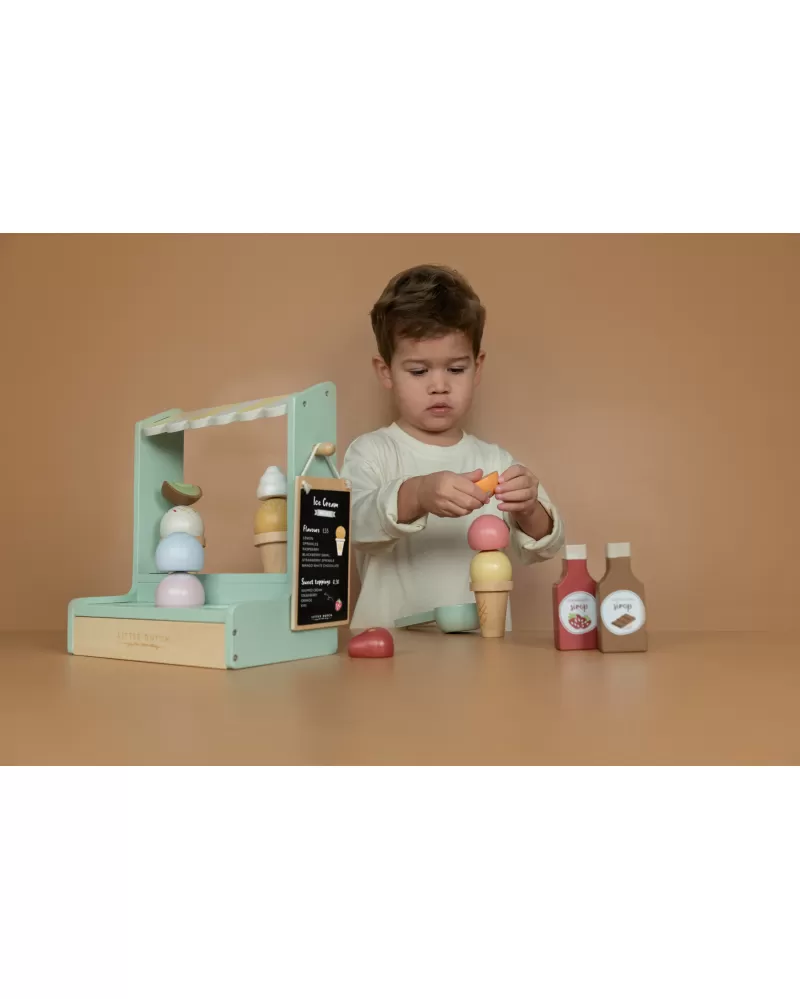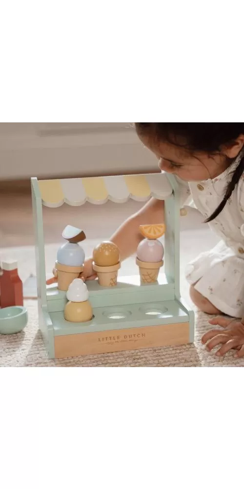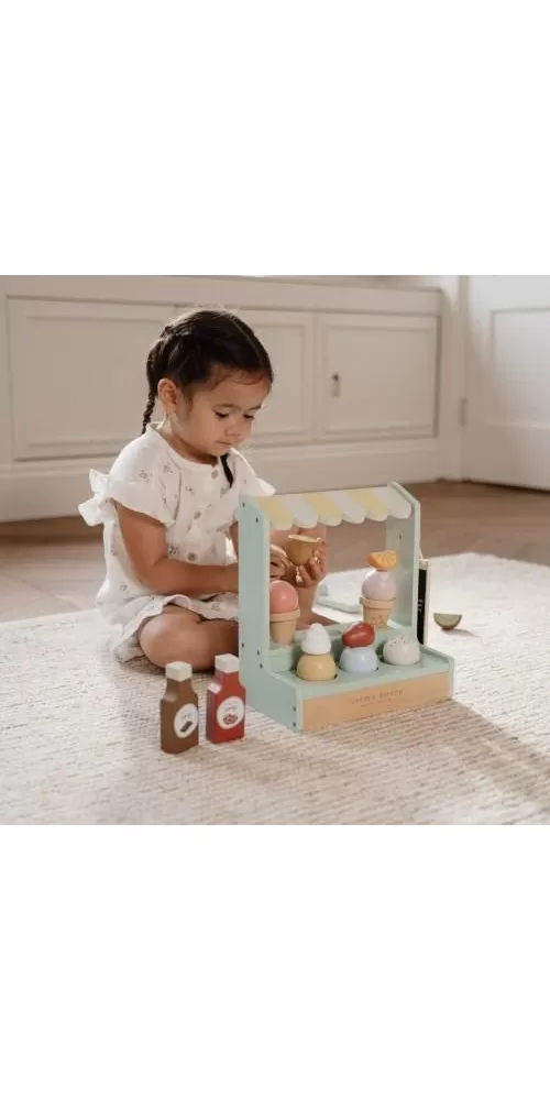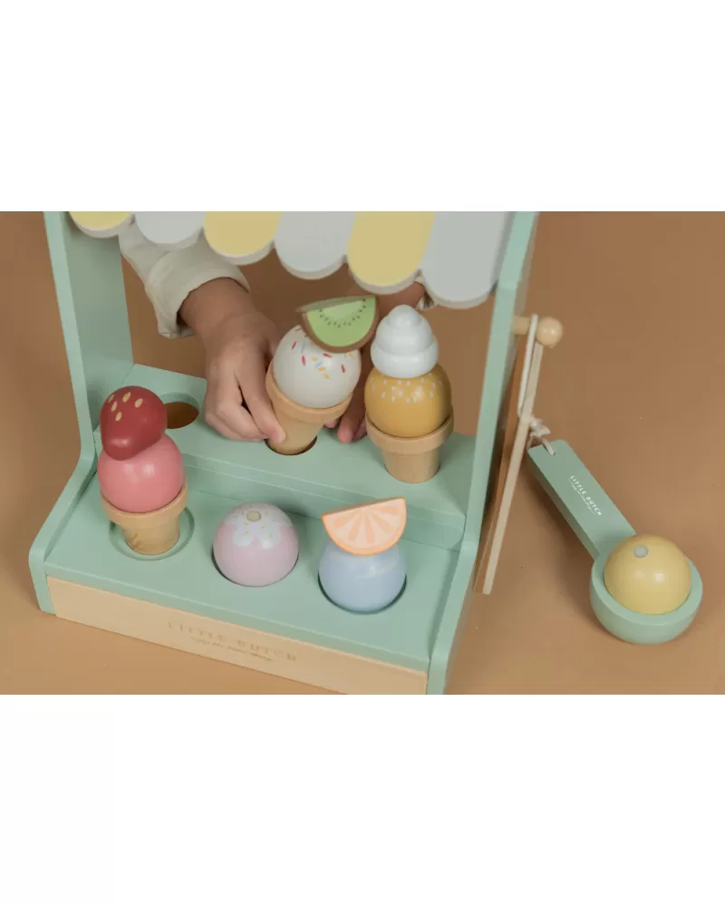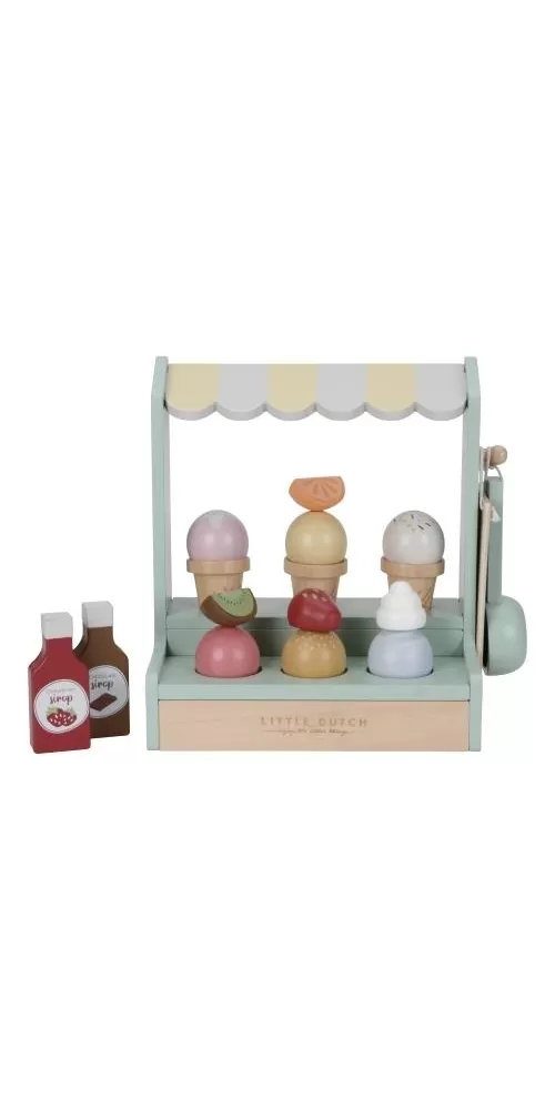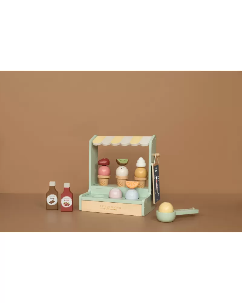 Jaká je vaše oblíbená příchuť zmrzliny? Vanilková nebo jahodová? Tento zmrzlinový stánek s roztomilou žlutobílou markýzou vás zve k ochutnání hned šesti příchutí. K dispozici jsou tři kornouty, které můžete naplnit kopečky zmrzliny a dozdobit ovocem, šlehačkou a jednou ze dvou polev.