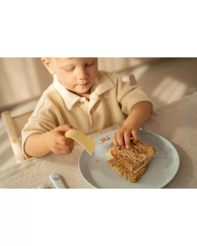 Dětský talíř je vhodný pro samostatné stolování dítěte, díky praktickému úchytu se snadno přenáší. Miska je ideální pro servírování dětským zeleninových či ovocných příkrmů, polévek, kaší, ovoce apod. Talíř i miska jsou vyrobeny z lehkého, mimořádně odolného plastu. Kelímek z průhledného, odolného plastu je ideální pro děti, které se učí pít ze skleničky. Příbor z kvalitní nerezové oceli s plastovou rukojetí pro snadné držení usnadní dítěti přechod z krmení lžičkou na stolování s příborem.