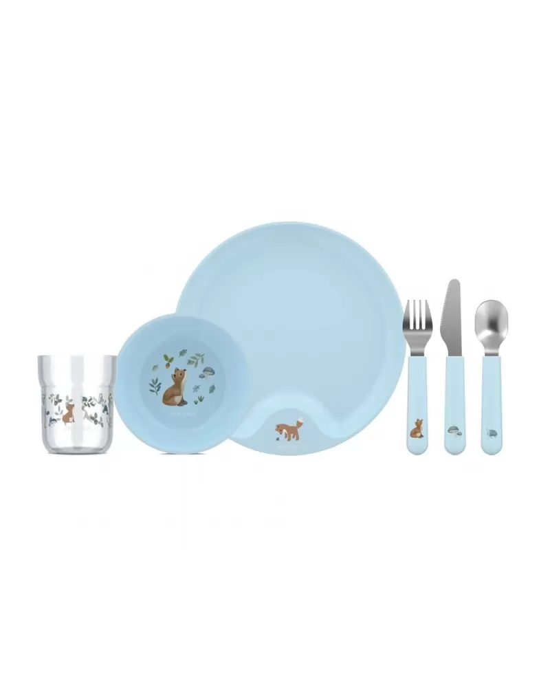 6-dílná jídelní sada v krásném designu s jemným potiskem obsahuje dětský talíř, misku, kelímek, lžíci, vidličku a nůž.